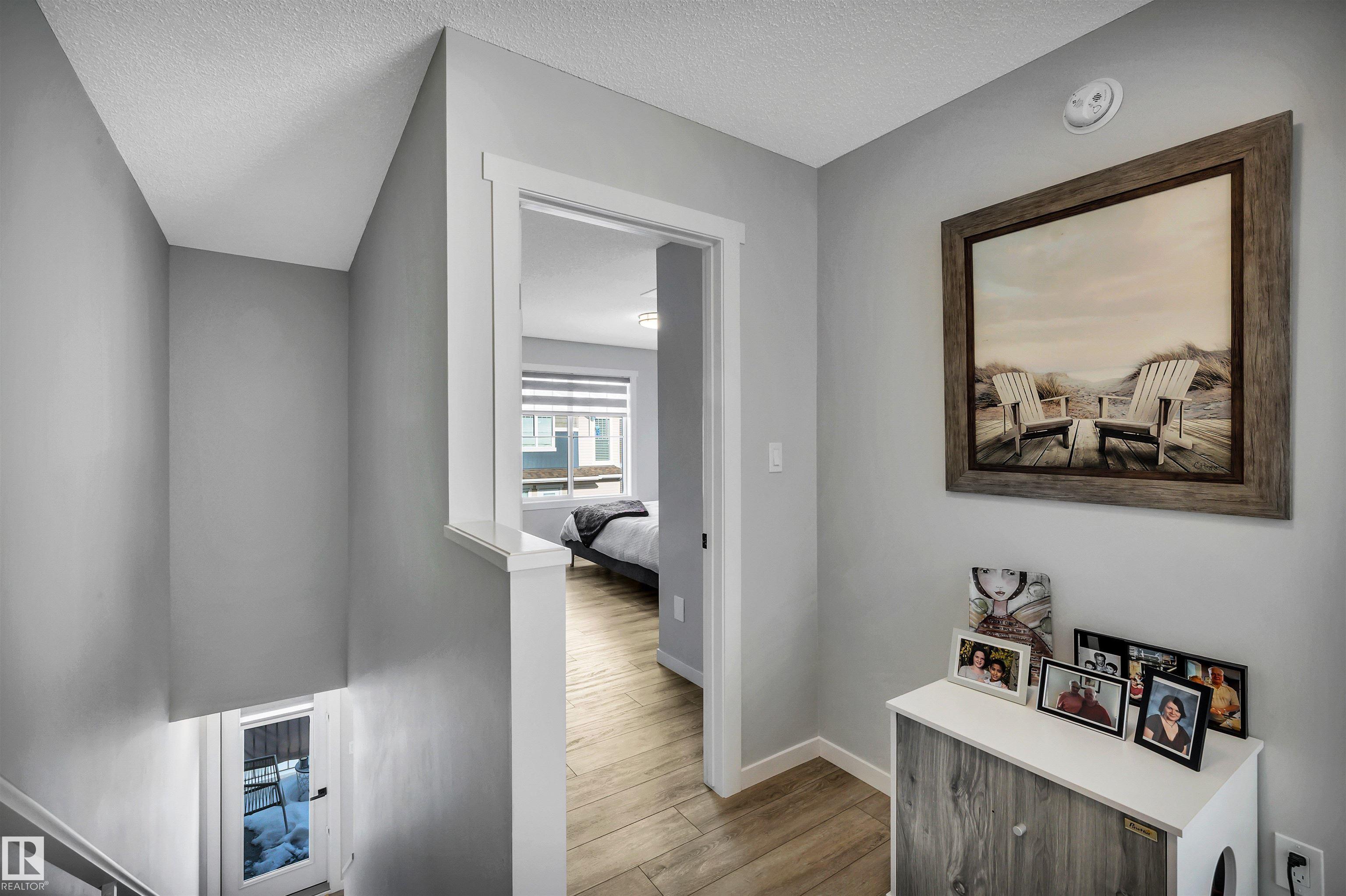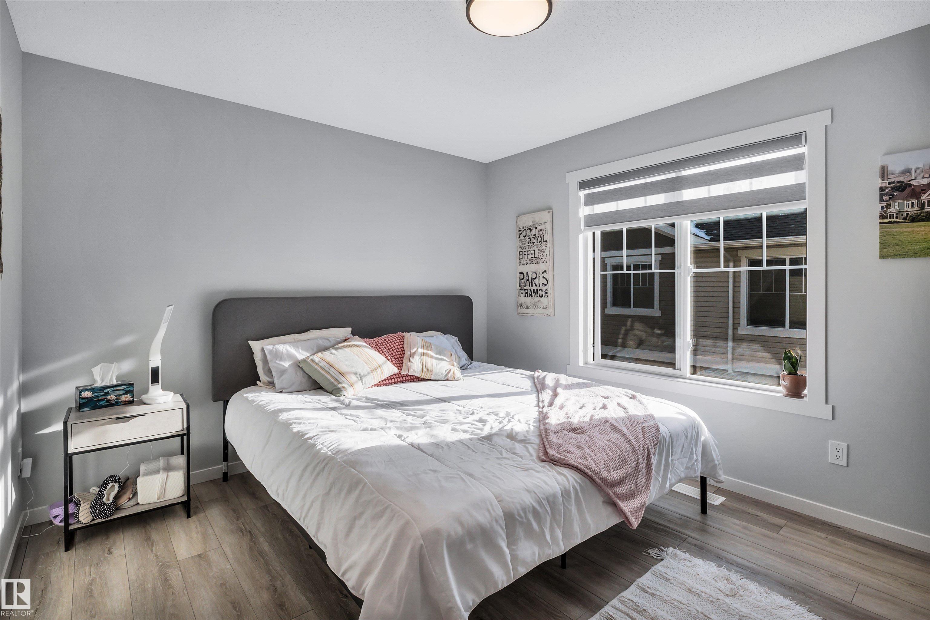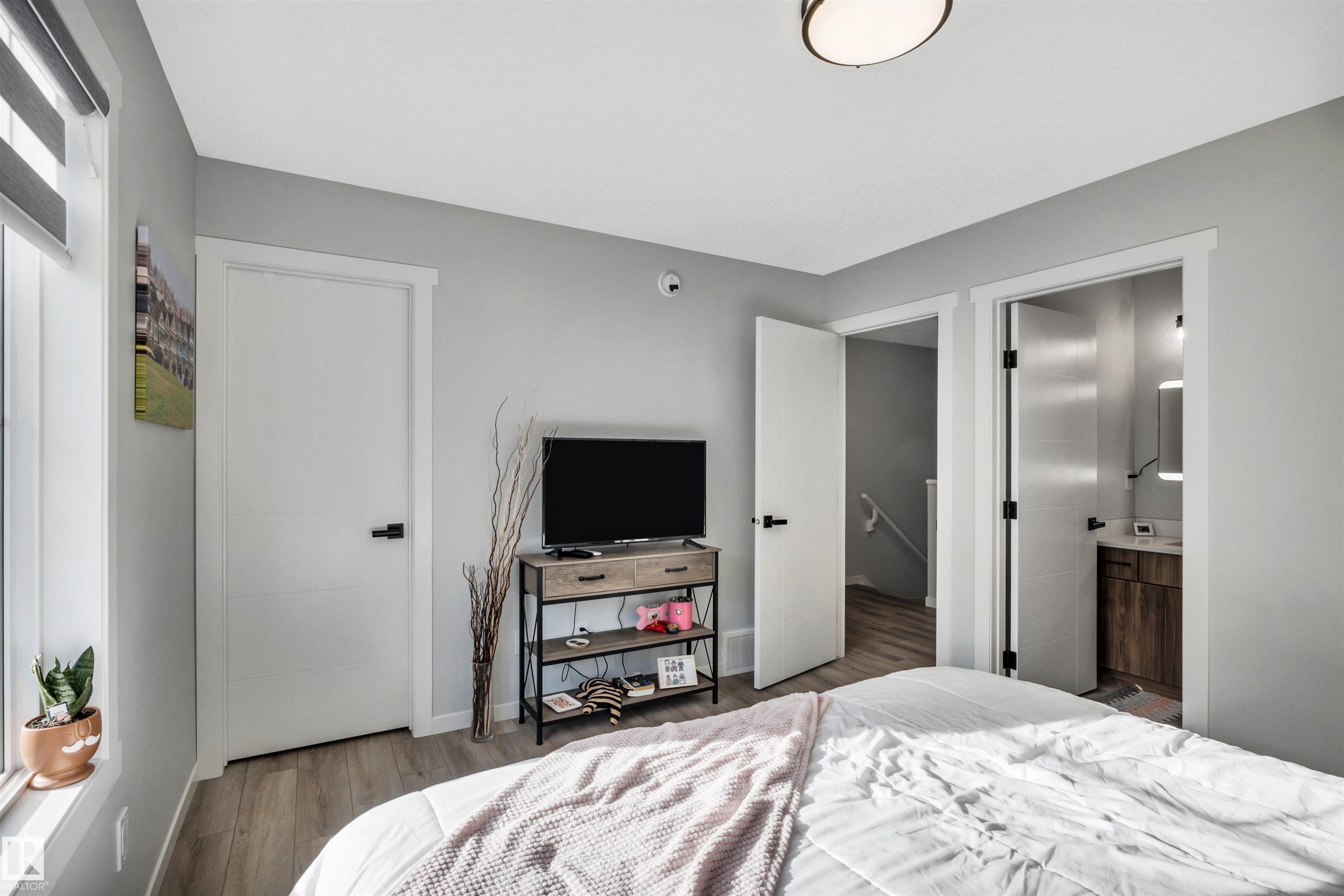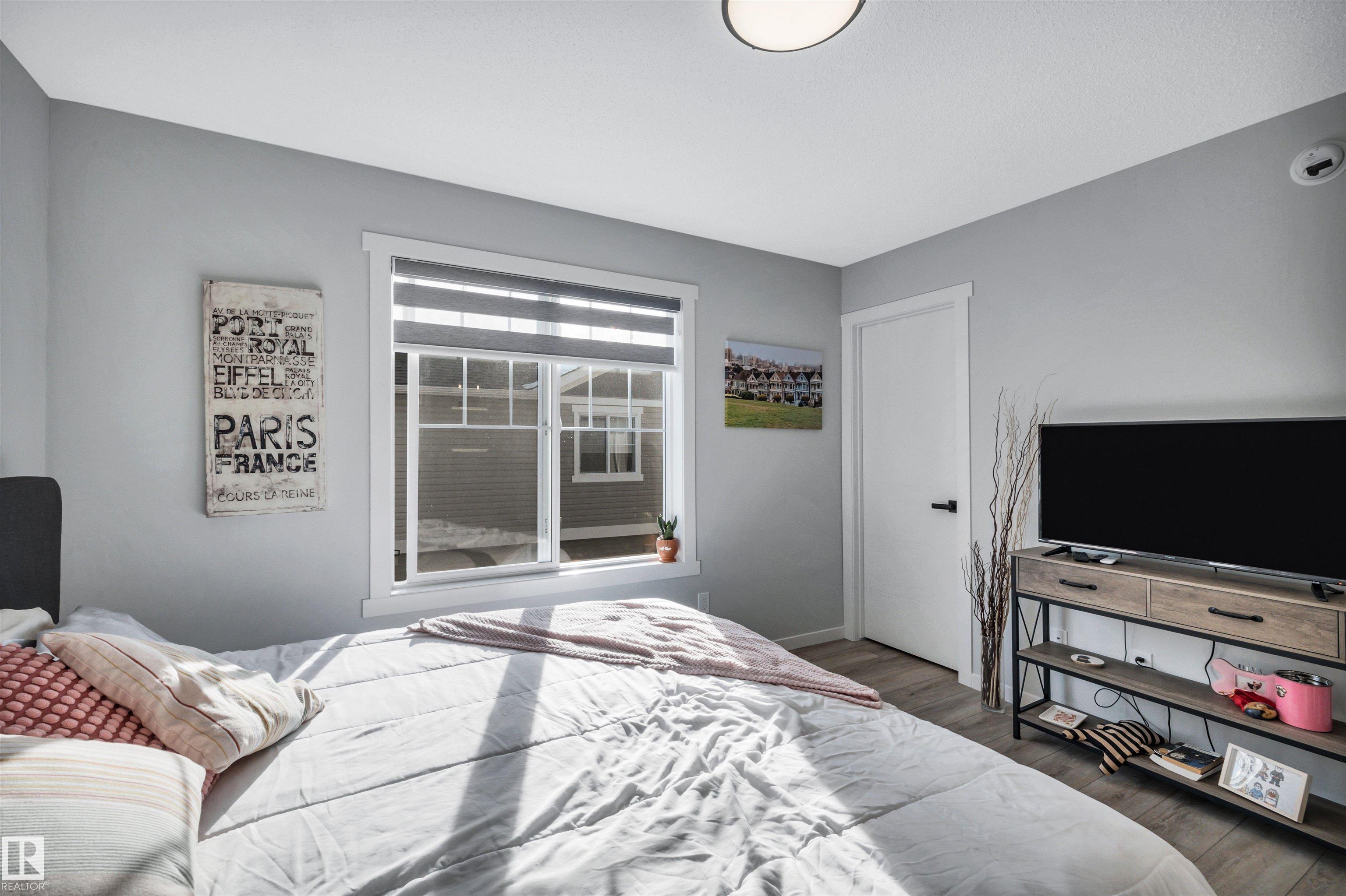 Modern 1408 sq. ft. 3 storey townhouse is in immaculate condition! The owners carefully planned every upgrade to maximize comfort, quality and long-term enjoyment. No carpet here, vinyl plank flooring throughout! Stunning kitchen with upgraded quartz countertops, soft close drawers & cabinets and upgraded stainless steel appliances. The dining room has a built-in coffee bar plus a mini fridge and a walk-in pantry. The living room has an electric fireplace and large windows. Balcony off the living room is perfect to BBQ or enjoy your morning coffee. There are 2 primary bedrooms on the 3rd floor, each with their own walk-in closet and ensuite featuring granite counters, heated towel racks and LED lit mirrors! Zebra blinds throughout the unit. A main floor flex room and access to the double attached garage complete this home. Central A/C and vacuum. Quiet location with shopping, walking trails and a pond nearby.