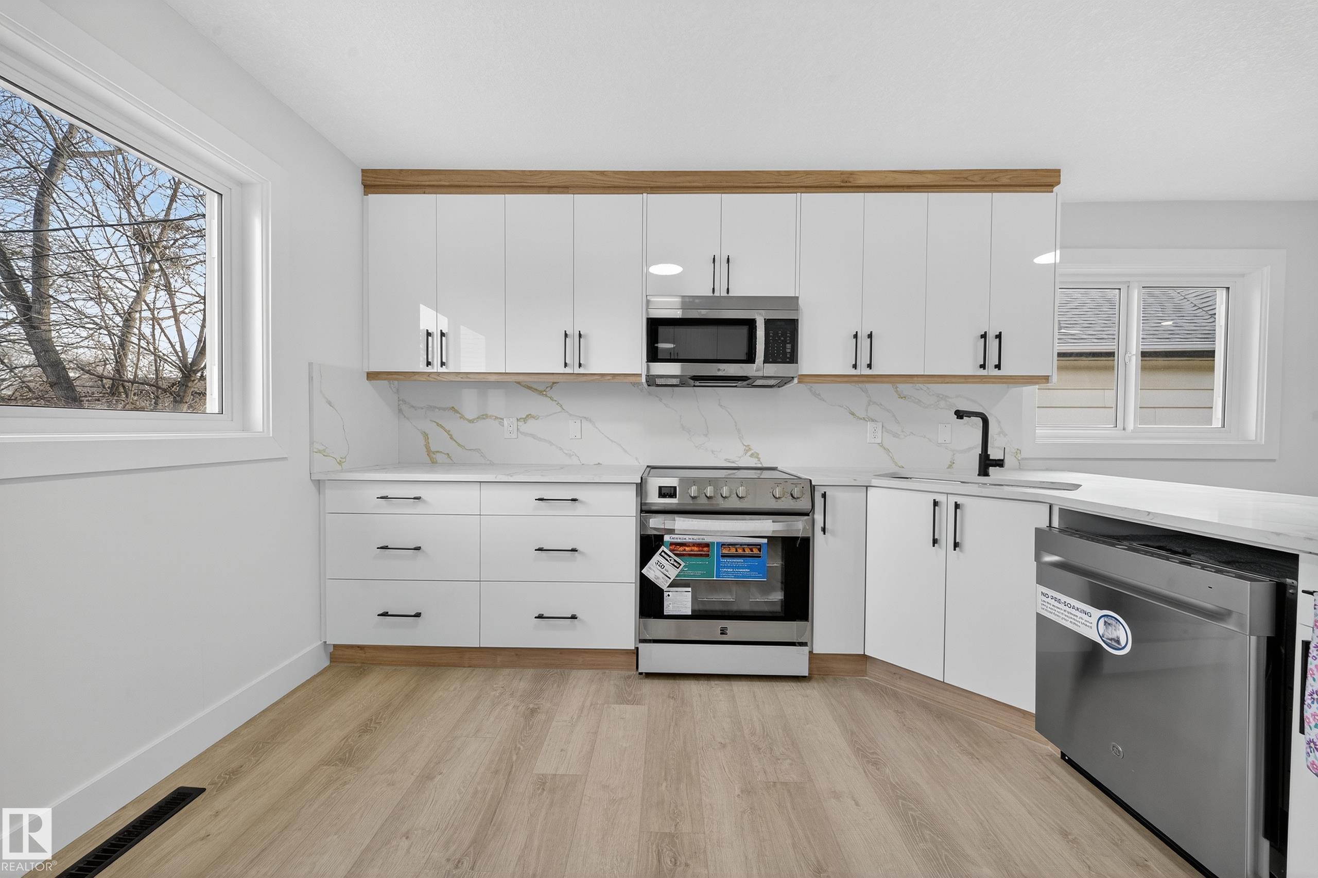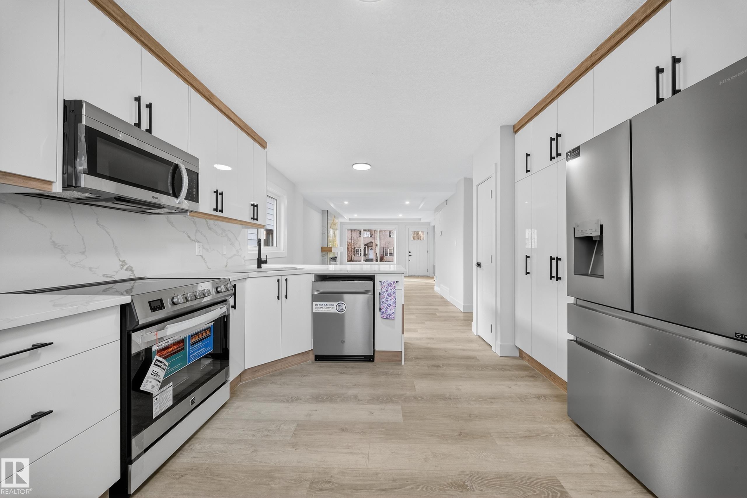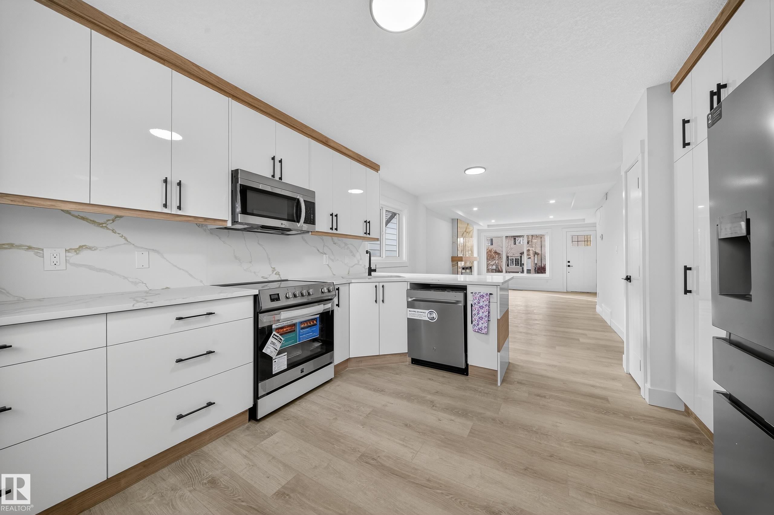 Welcome to this beautifully renovated bungalow in Eastwood! Situated on a regular lot, this home offers 6 bedrooms and 3 full bathrooms with a second kitchen and separate entrance--perfect for extended family or rental potential. The main floor features 3 bedrooms, 2 full baths, and a stunning new kitchen with modern cabinetry, quartz countertops with quartz backsplash, stainless steel appliances, and main-floor laundry. The fully finished basement includes 3 additional bedrooms, a full bath, a brand-new kitchen, and separate laundry. Recent upgrades include new shingles (home & garage), new furnace, new over sized windows, doors, baseboards, lighting, paint, MDF shelving, upgraded bathrooms, new concrete walkways, driveway, plumbing, electrical, upgraded insulation and a new hot water tank. An oversized double detached garage offers ample parking and storage. Close to schools, parks, shopping, and public transit, this move-in-ready home shines with quality upgrades inside and out!
