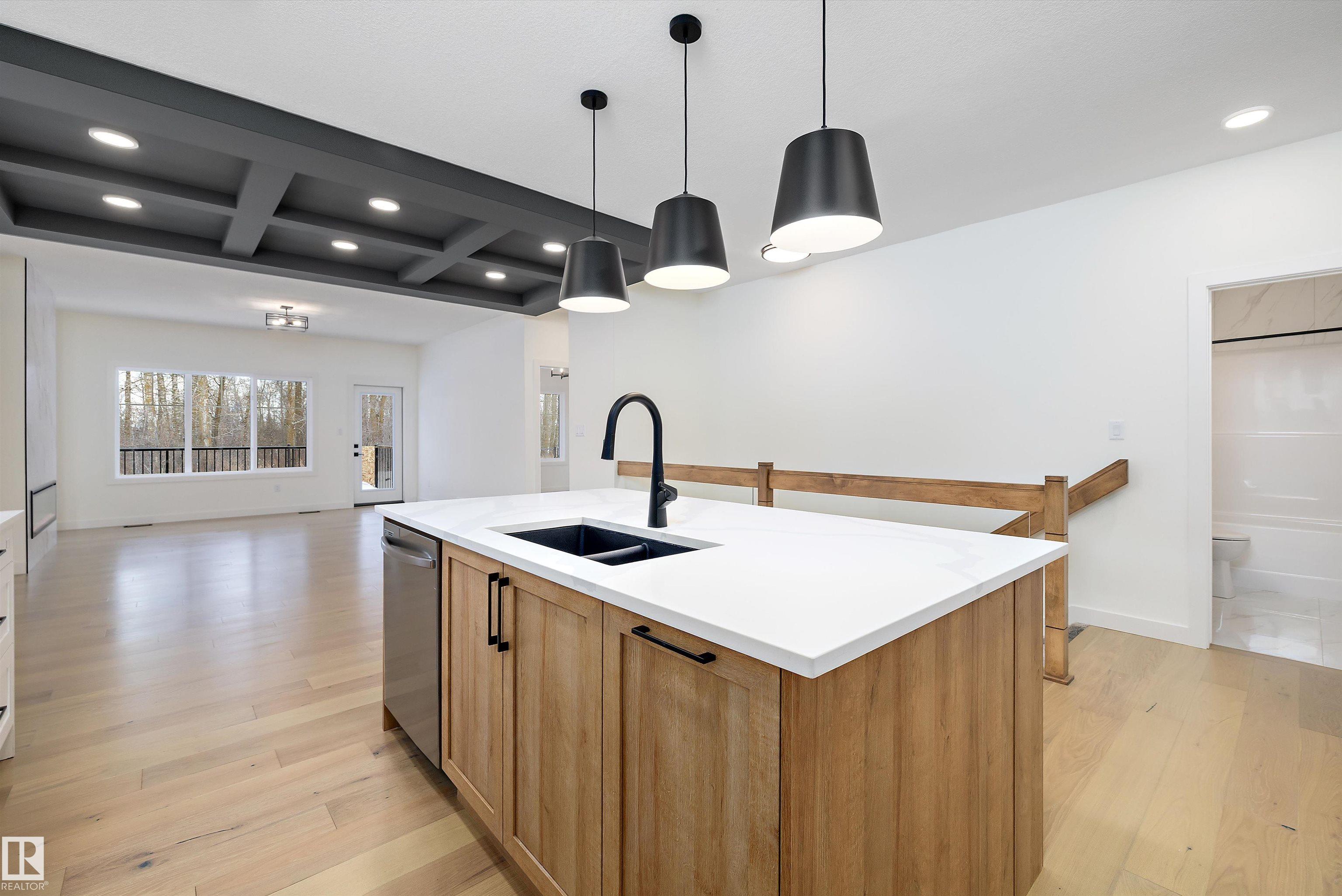 Welcome to this beautiful Ravine Backing 1450 Sqft award winning Coventry Bungalow built by Blackstone Homes in Woodhaven Edgemont. This home has won the best home with Canadian Home Building Association. Upon entering you will be impressed by the huge foyer with beautiful wainscotting. The chef's dream kitchen offers up to the ceiling cabinets, large island, built-ins, and open to dining room with beautiful coffered ceilings. Spacious Great room w/ large windows & fireplace with tiles. On the main floor you will find huge Master bedroom with beautiful ensuite - stand alone tub, double sinks shower & 10MM frameless glass. Mudroom with bench, built ins & laundry. Other features - MDF shelving, South backyard deck with metal railing, master feature wall, black plumbing & fixtures, maple railing, quartz countertops, 9' main & basement ceilings, engineered hardwood, stainless steel appliances, Ravine backing w/ walking trail and New home warranty, Close to amenities & quick access to Anthony Henday drive.