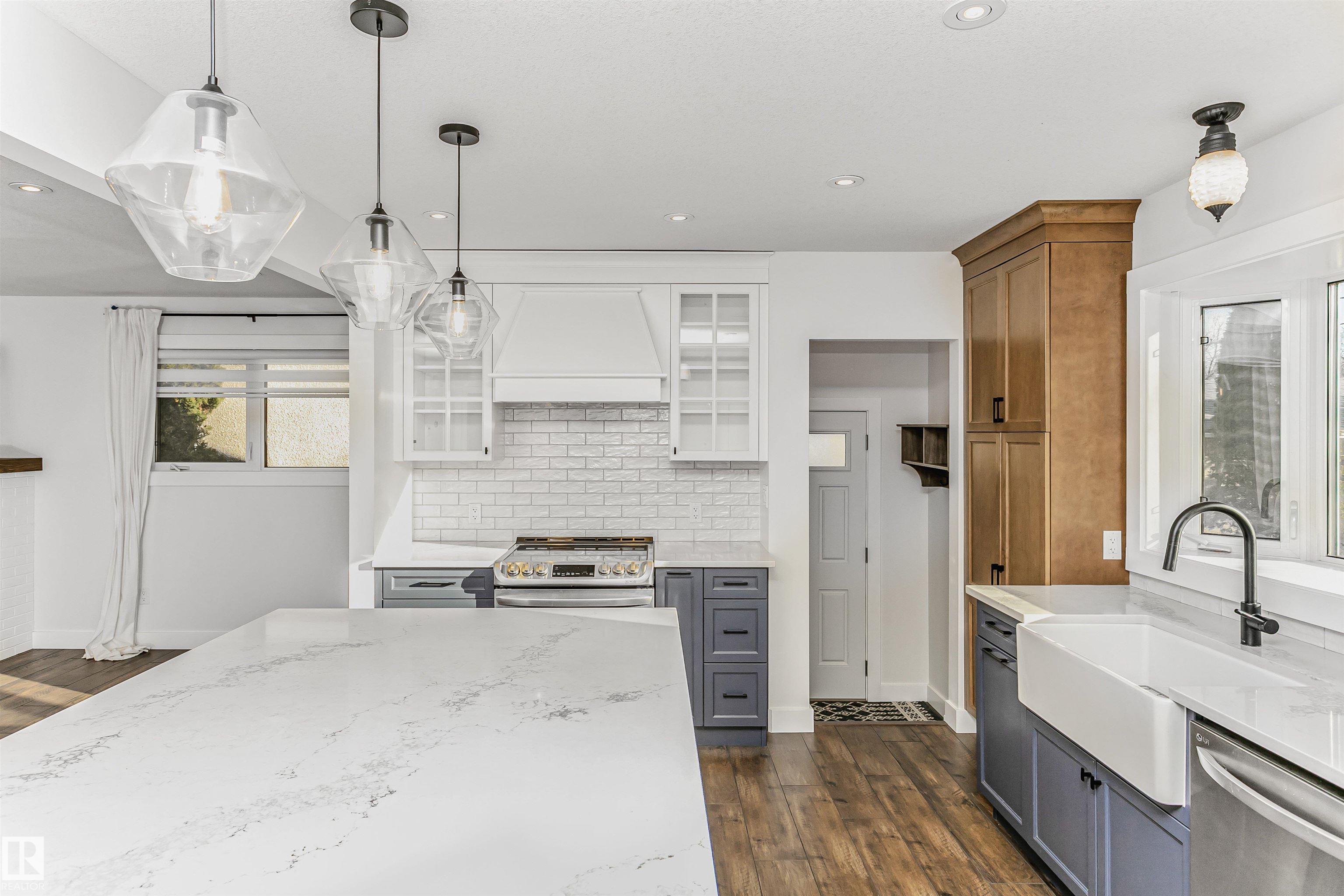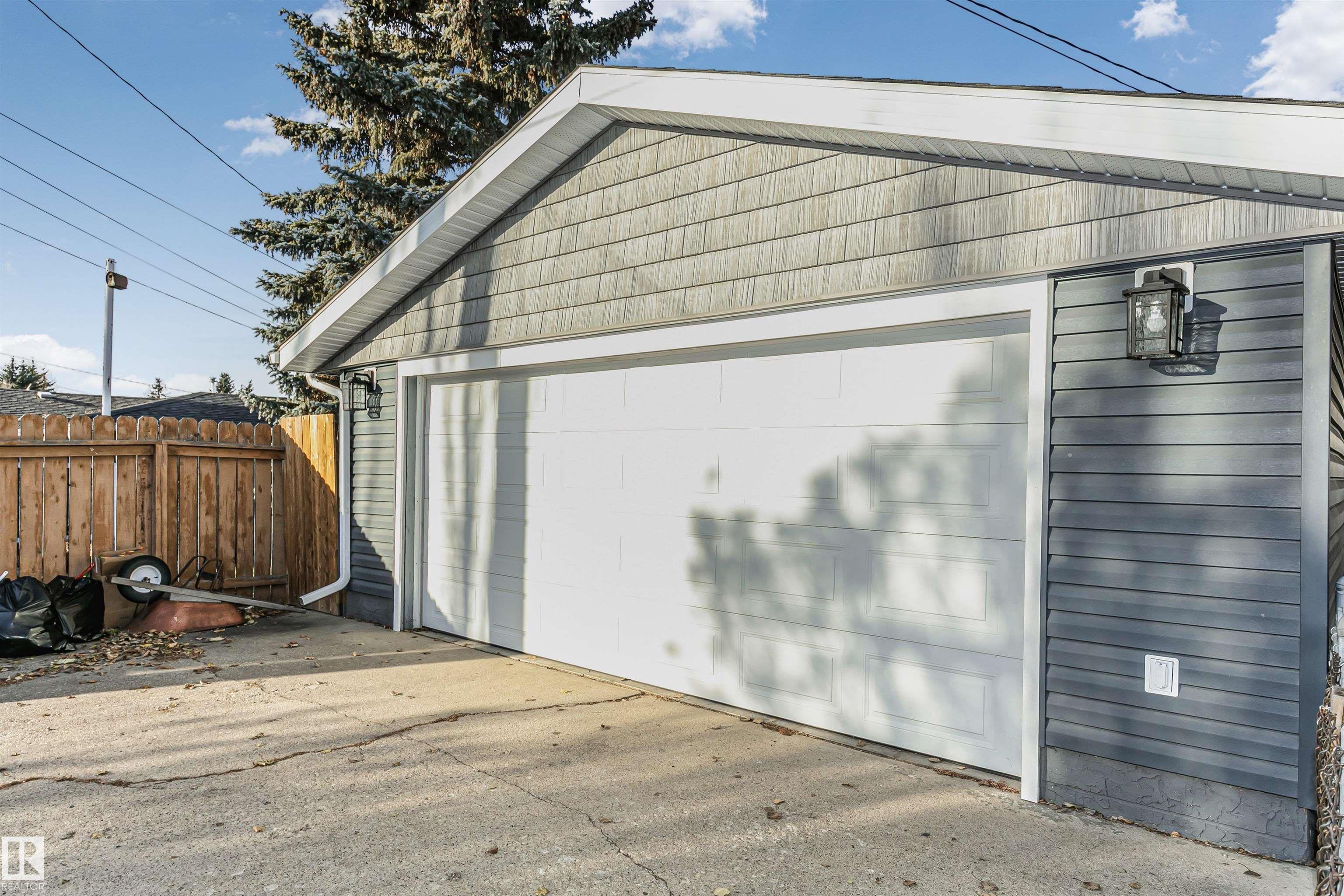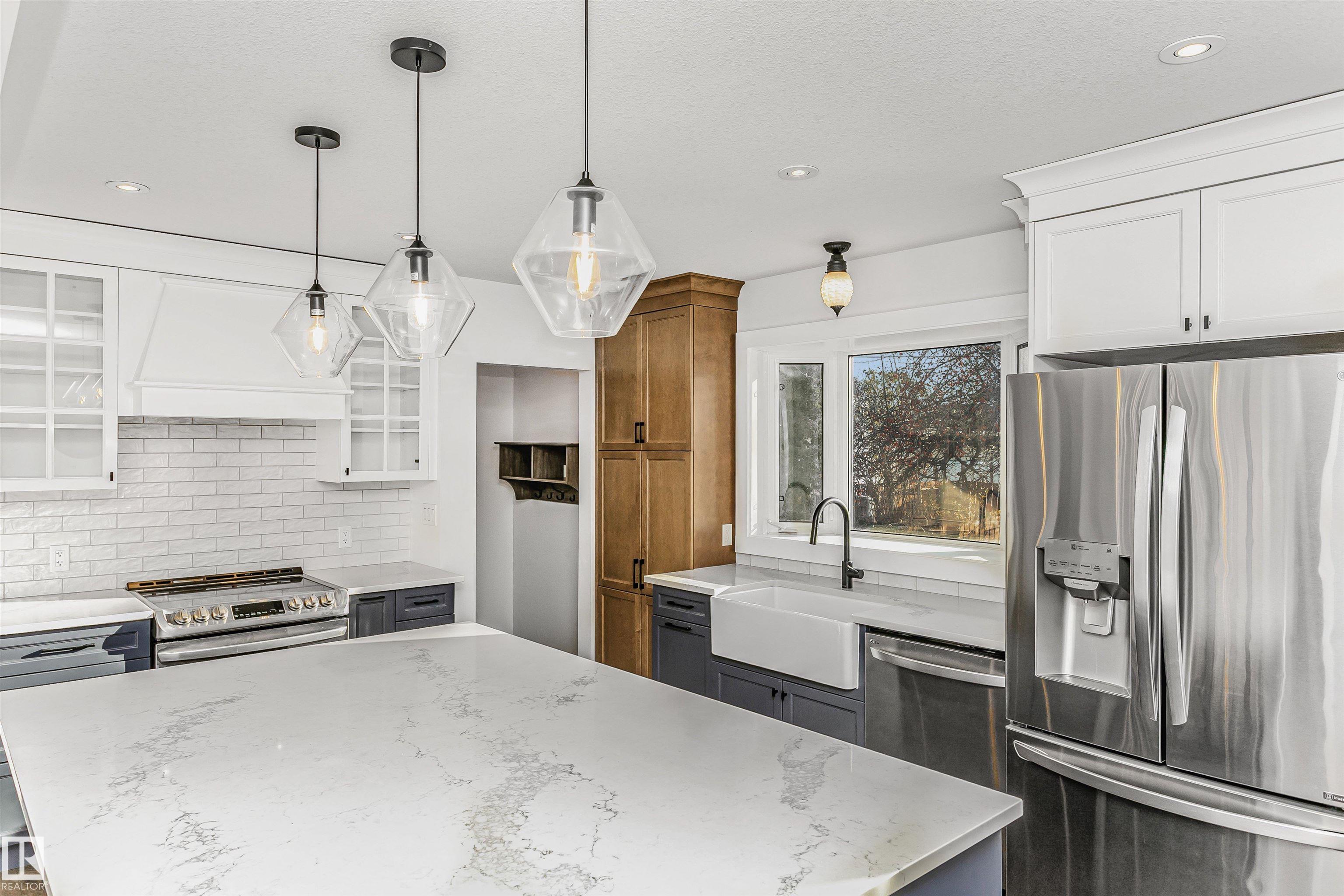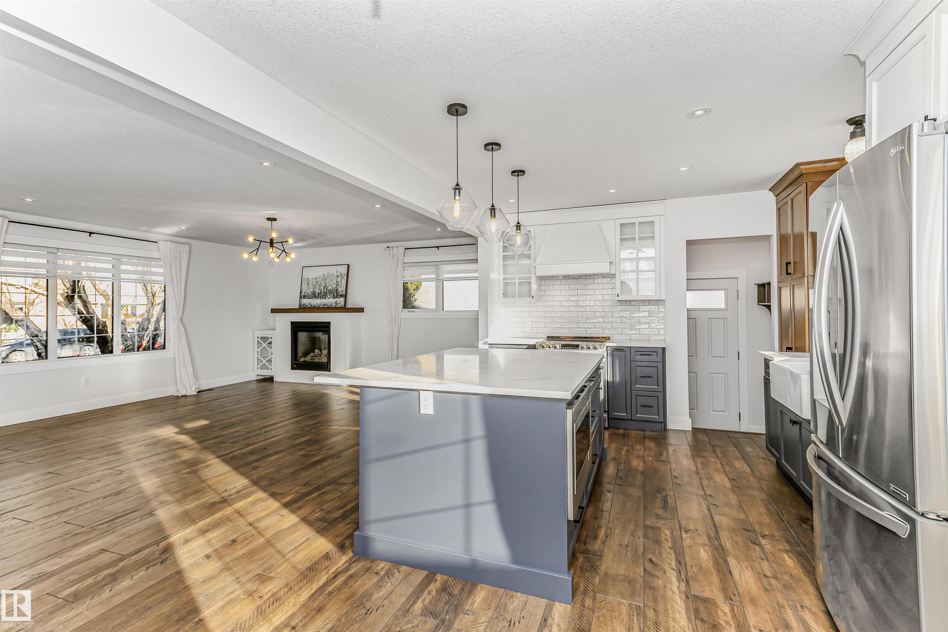 Beautifully renovated bungalow in the desirable neighbourhood of Fulton Place. The open concept main floor includes modern wide-plank wood flooring throughout. The tastefully upgraded kitchen includes a large quartz eat-in island, stainless steel appliances, white quartz counters and tons of stylish cabinetry. The kitchen looks out to a large bright living room with lots of windows, finished with a white brick-surround gas fireplace. Down the hall is a spacious primary bedroom and 2nd bedroom adjacent to a 5-piece bath with double sinks and a vanity station. The basement includes a large recreation room open to a room with a wrap around wet bar (can easily be converted to 3rd bedroom), an additional full bath and tons of storage space. Additional features include A/C (2023) an oversized, heated double garage, beautiful spacious yard and recent upgrades including: windows, siding, deck, furnace and insulation. Close to the Whitemud and only minutes from shopping and all amenities, this home is a must see!