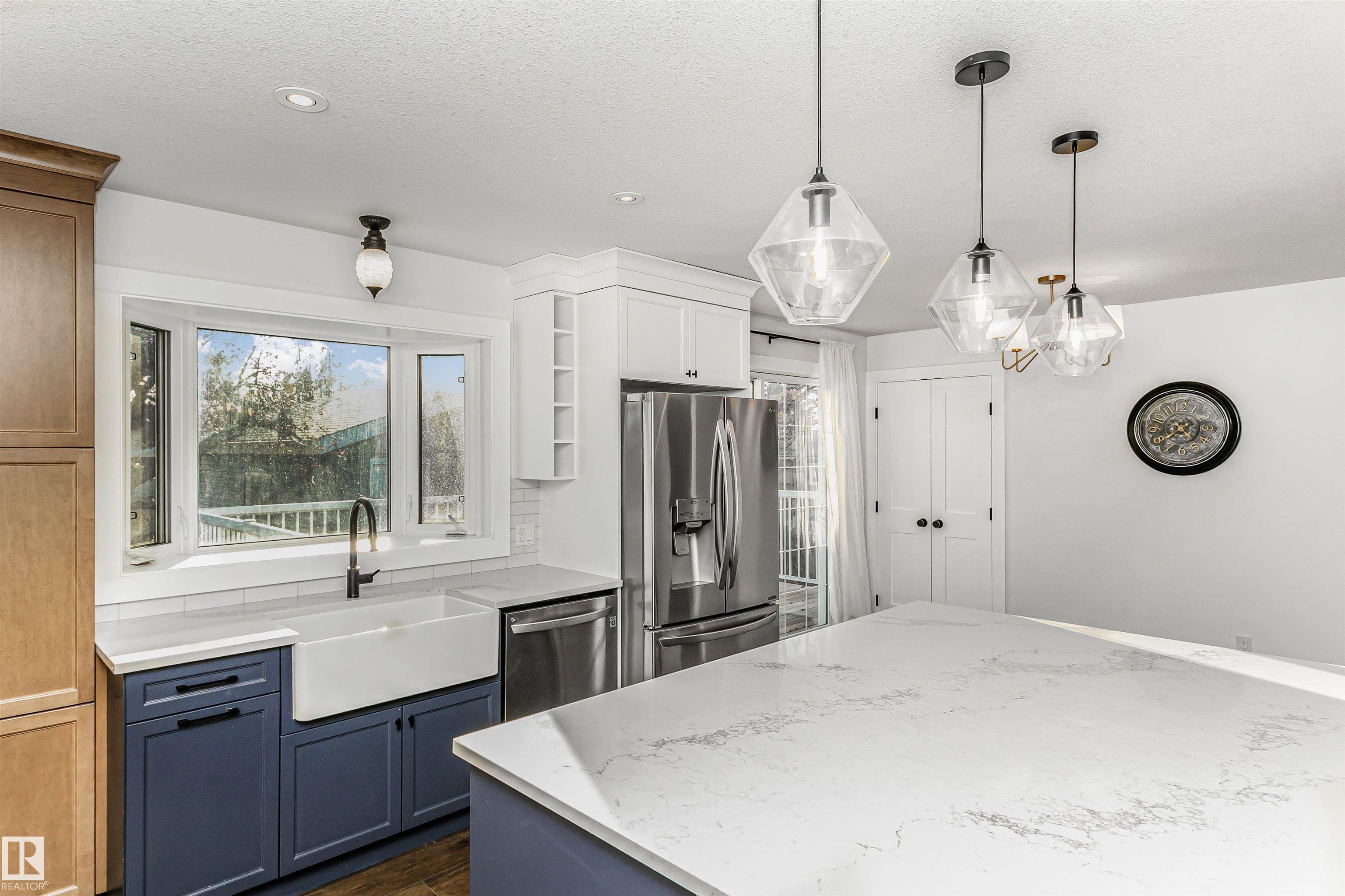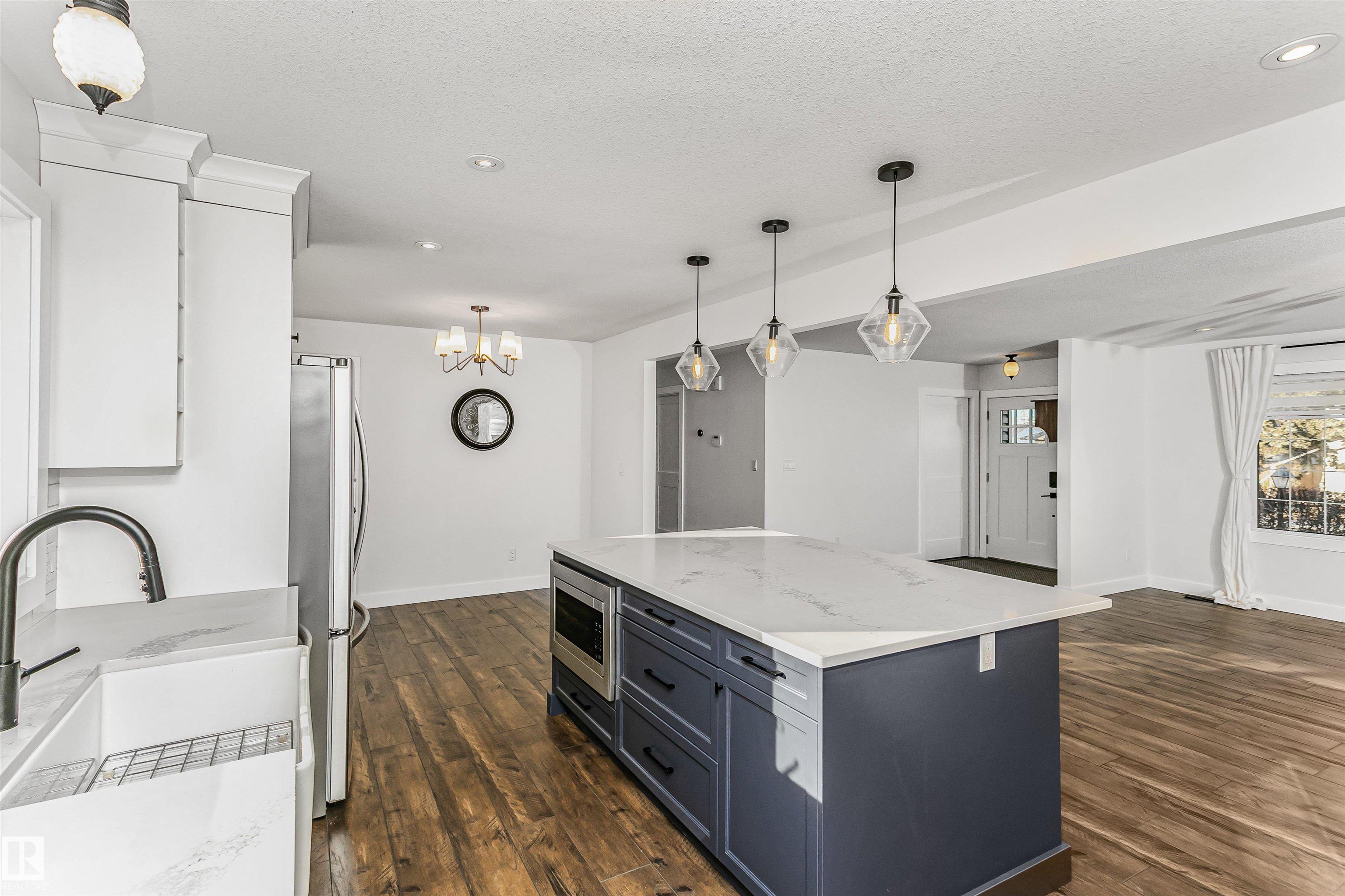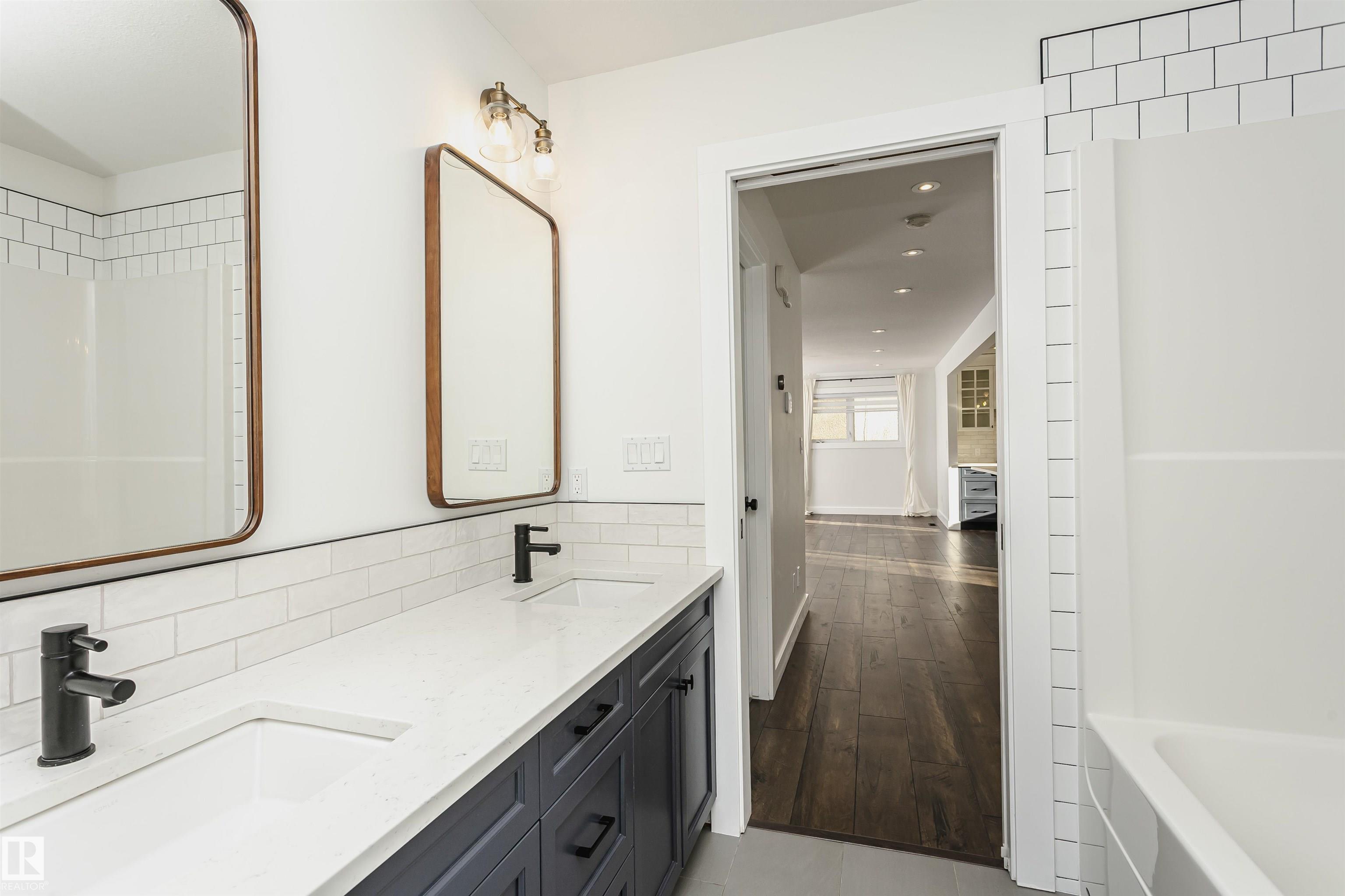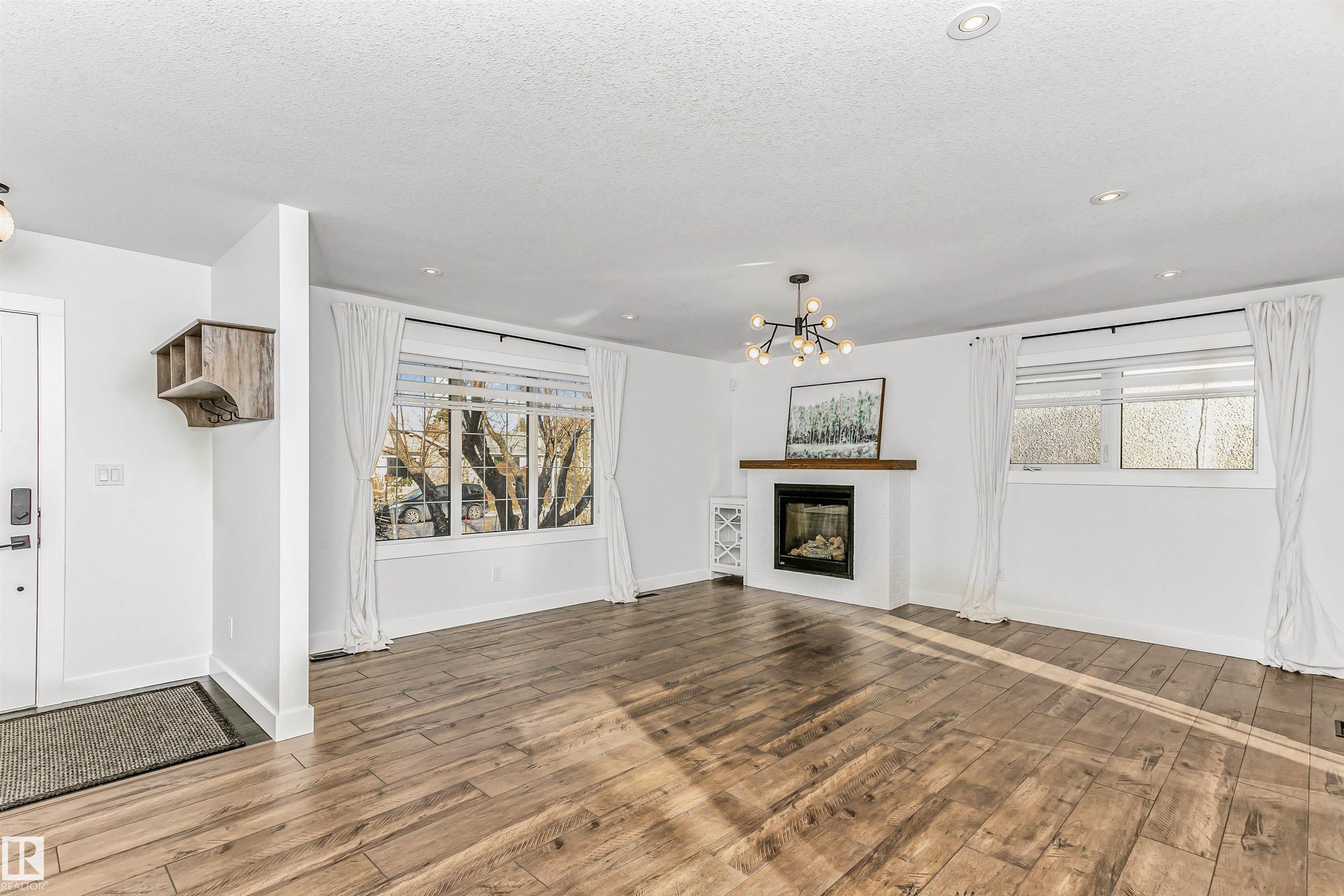 Beautifully renovated bungalow in the desirable neighbourhood of Fulton Place. The open concept main floor includes modern wide-plank wood flooring throughout. The tastefully upgraded kitchen includes a large quartz eat-in island, stainless steel appliances, white quartz counters and tons of stylish cabinetry. The kitchen looks out to a large bright living room with lots of windows, finished with a white brick-surround gas fireplace. Down the hall is a spacious primary bedroom and 2nd bedroom adjacent to a 5-piece bath with double sinks and a vanity station. The basement includes a large recreation room open to a room with a wrap around wet bar (can easily be converted to 3rd bedroom), an additional full bath and tons of storage space. Additional features include A/C (2023) an oversized, heated double garage, beautiful spacious yard and recent upgrades including: windows, siding, deck, furnace and insulation. Close to the Whitemud and only minutes from shopping and all amenities, this home is a must see!