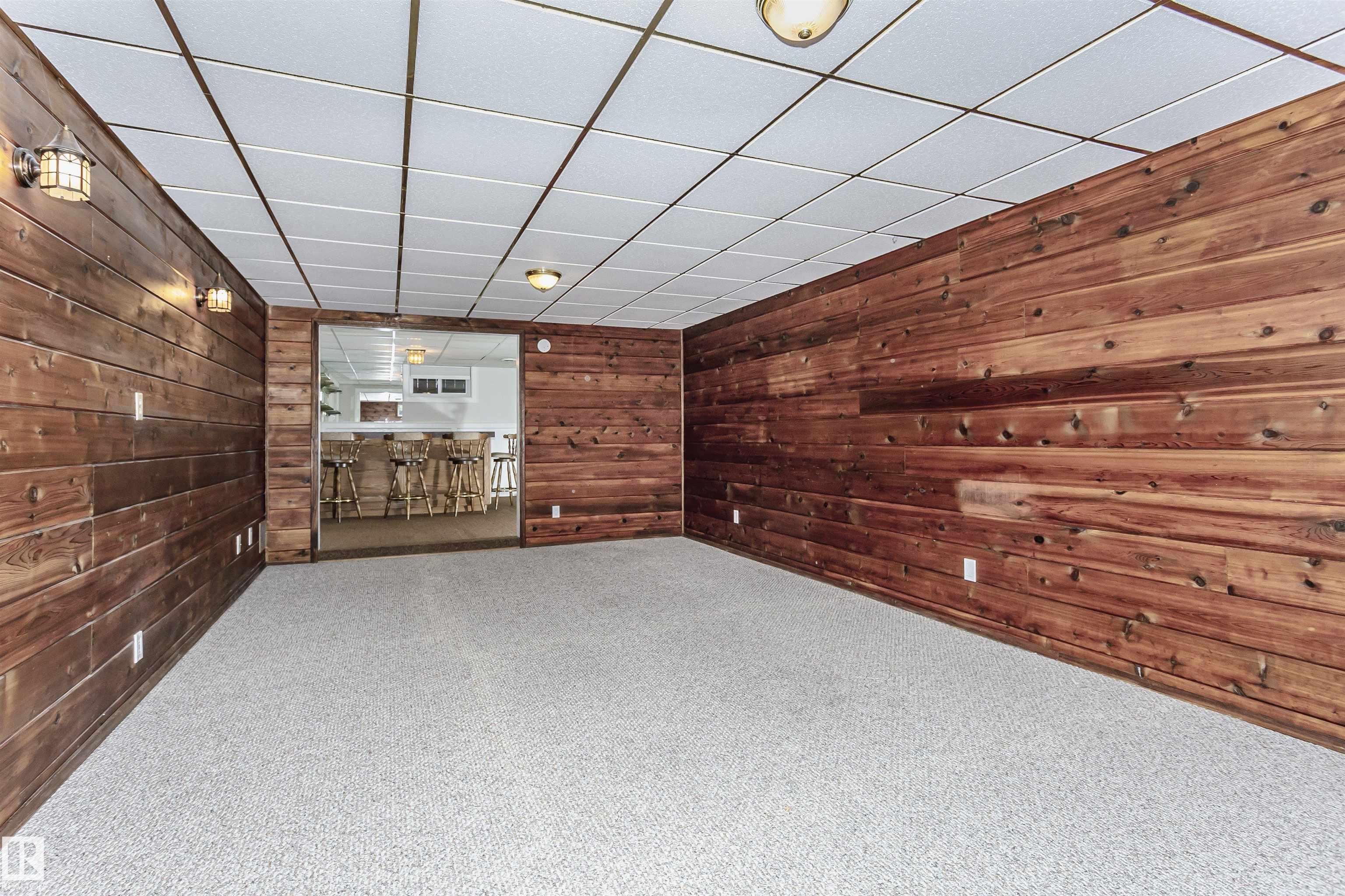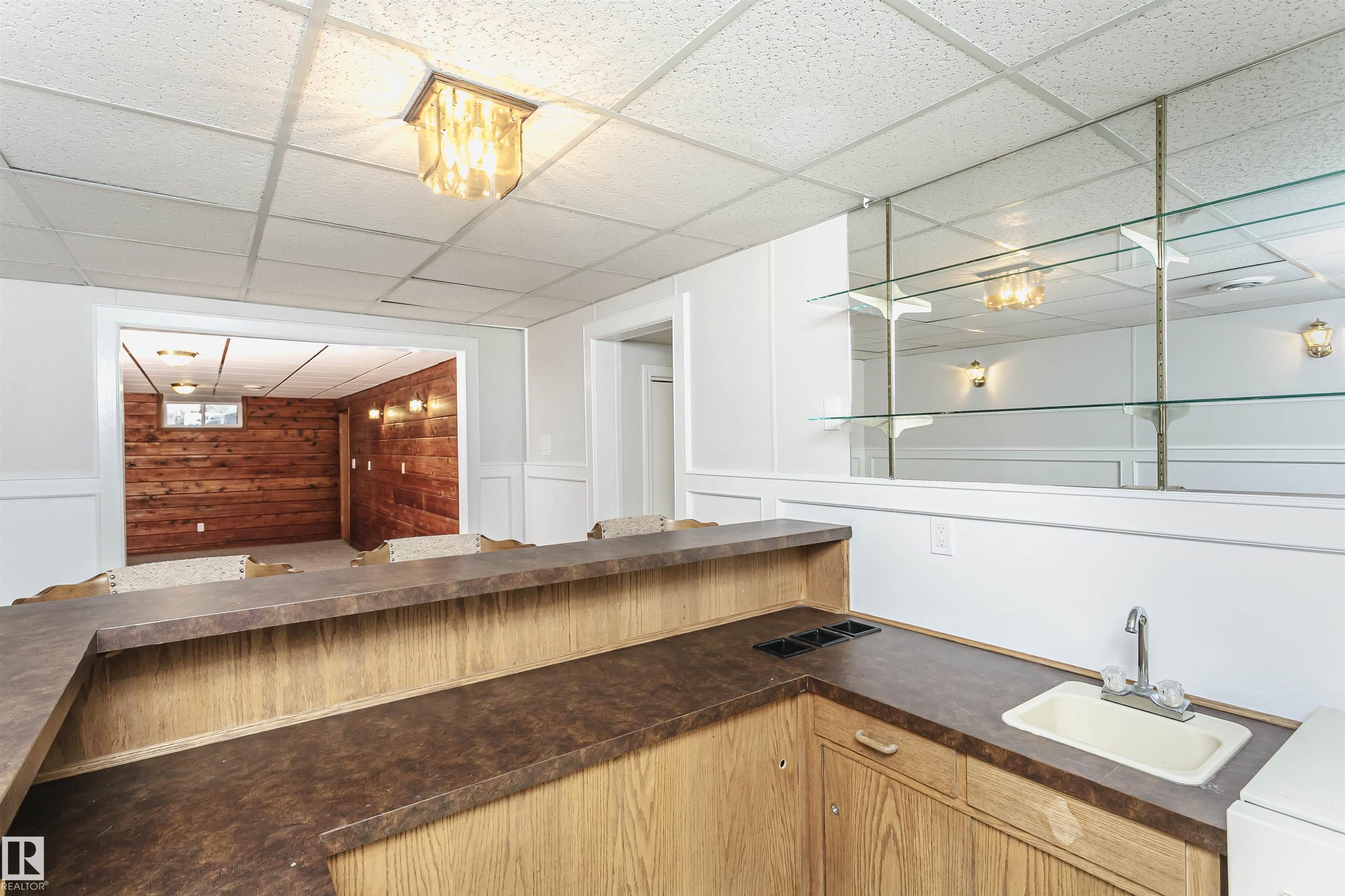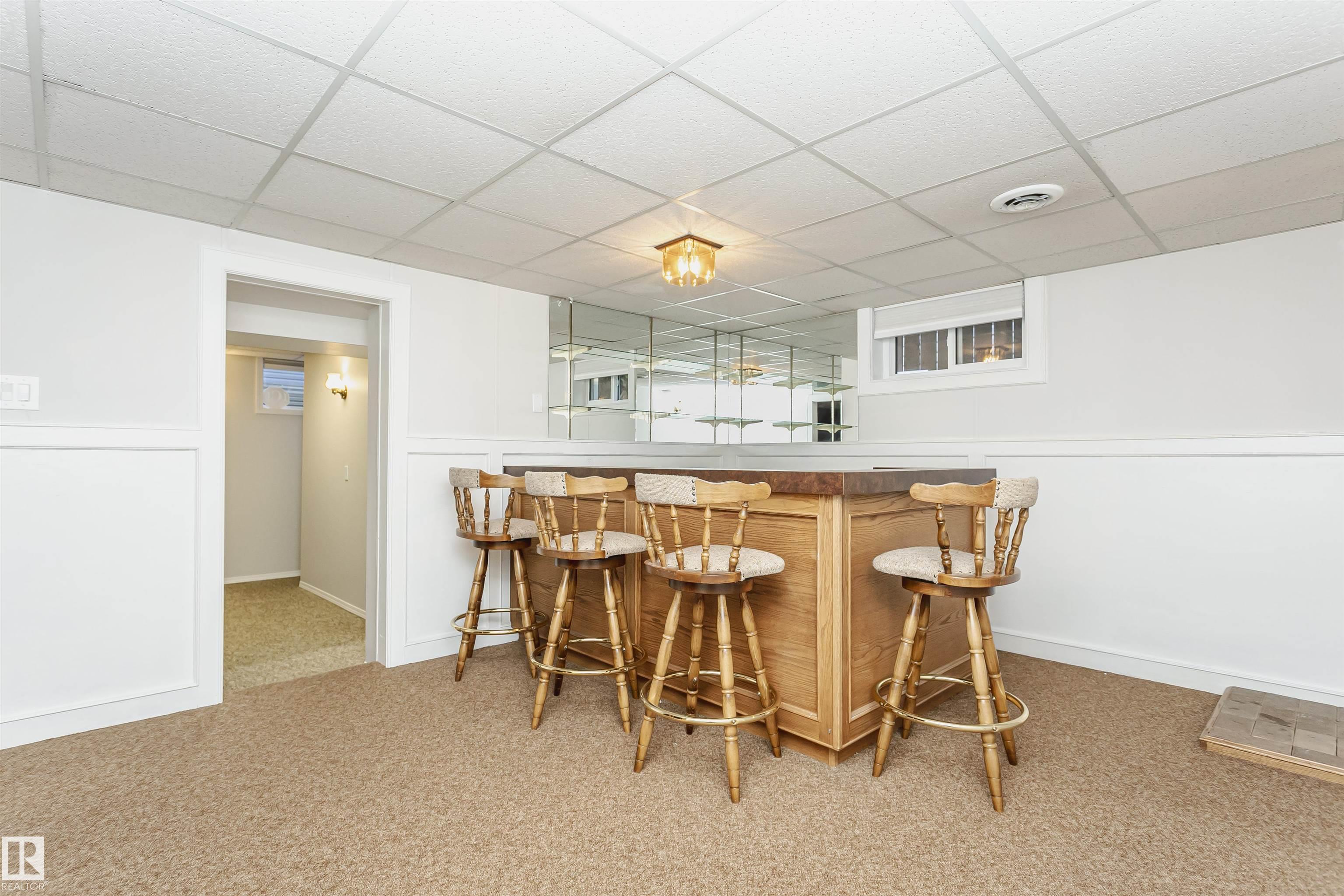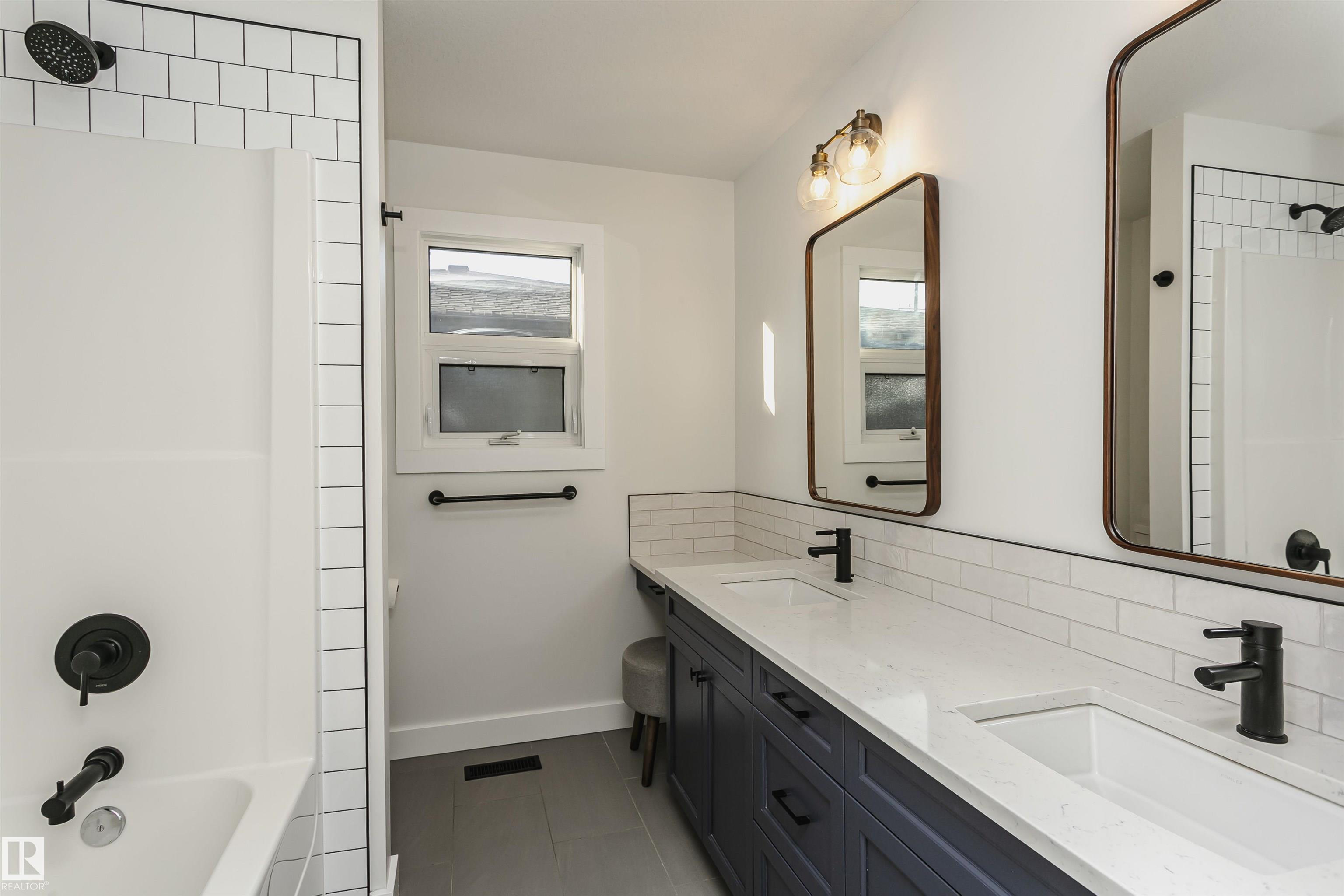Beautifully renovated bungalow in the desirable neighbourhood of Fulton Place. The open concept main floor includes modern wide-plank wood flooring throughout. The tastefully upgraded kitchen includes a large quartz eat-in island, stainless steel appliances, white quartz counters and tons of stylish cabinetry. The kitchen looks out to a large bright living room with lots of windows, finished with a white brick-surround gas fireplace. Down the hall is a spacious primary bedroom and 2nd bedroom adjacent to a 5-piece bath with double sinks and a vanity station. The basement includes a large recreation room open to a room with a wrap around wet bar (can easily be converted to 3rd bedroom), an additional full bath and tons of storage space. Additional features include A/C (2023) an oversized, heated double garage, beautiful spacious yard and recent upgrades including: windows, siding, deck, furnace and insulation. Close to the Whitemud and only minutes from shopping and all amenities, this home is a must see!