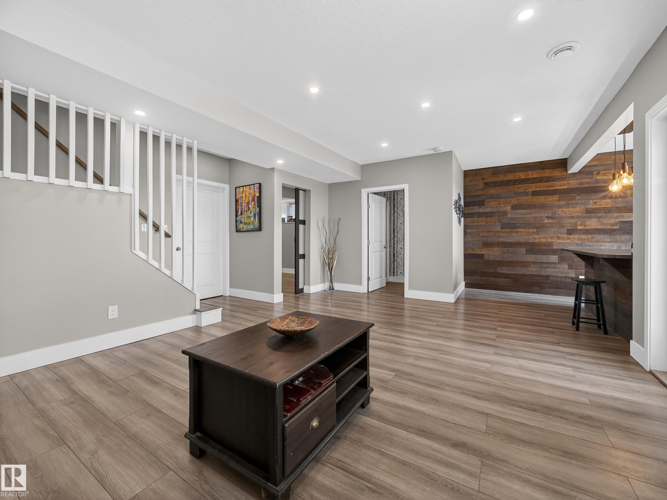 ~!WELCOME. HOME!~ BACKING ONTO PARK + SCHOOL LAND | WALKOUT BASEMENT | ~3,000 SQ FT DEVELOPED+ YOU NEED TO SEE THIS BASEMENT BAR>! Bright, fresh home with serious lifestyle value. Spacious foyer leads to a great room overlooking greenspace, complete with gas fireplace. KITCHEN; features full-height upgraded cabinets (glass fronts), walk-through pantry, gas stove, and large island eating bar. Dining opens to upper deck--perfect for summer BBQs. UPSTAIRS: bonus room with barn door (or 5th bedroom), 3 bedrooms, 4pc bath, and dedicated laundry with folding counter. PRIMARY retreat is fully loaded. BASEMENT: Fully finished walkout basement features family room with wet bar, sink, dual beverage coolers, cooktop, additional bedroom, and 4pc bath. OUTSIDE: interlocking brick, raised gardens, raspberry patch, and direct gate access to trails.