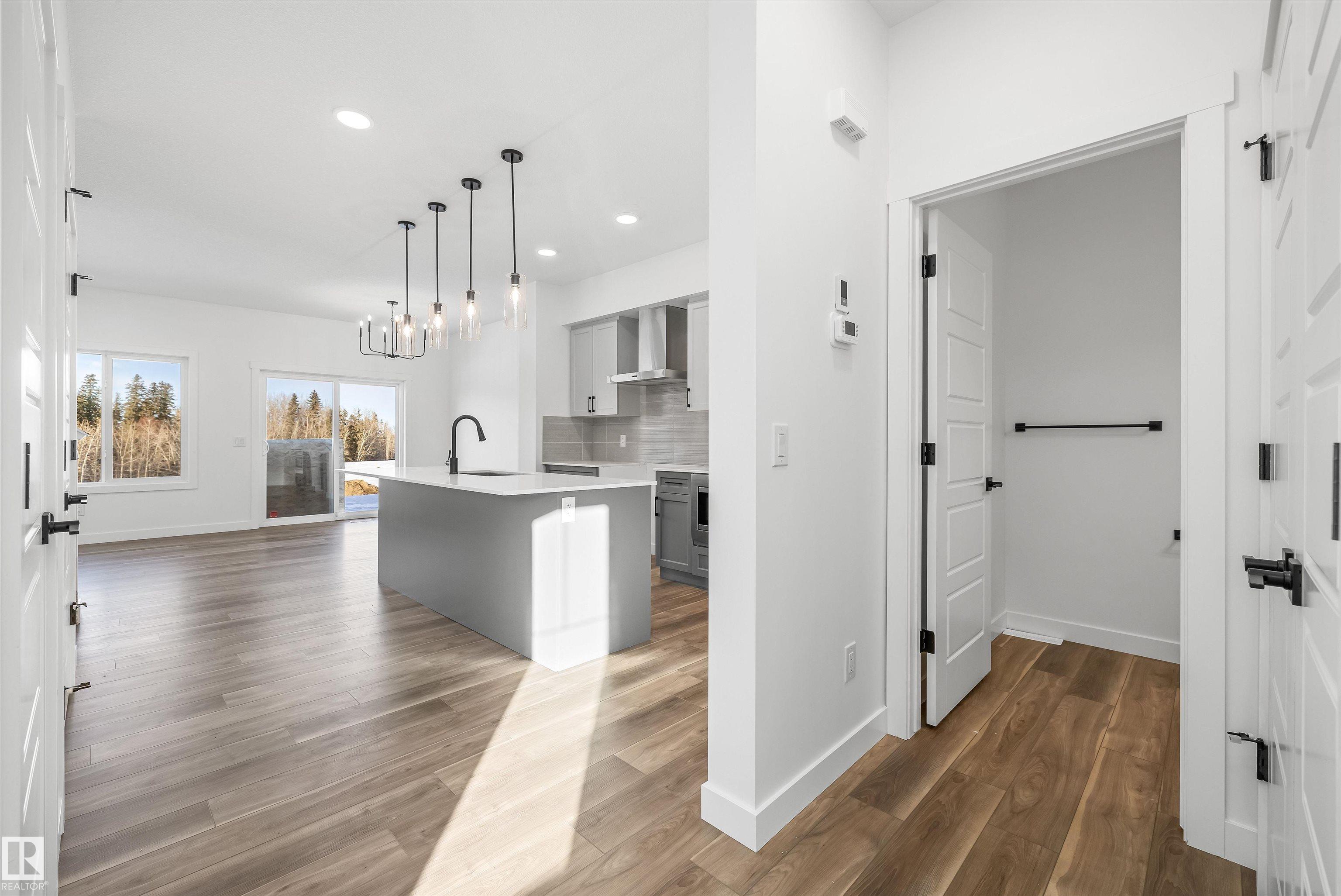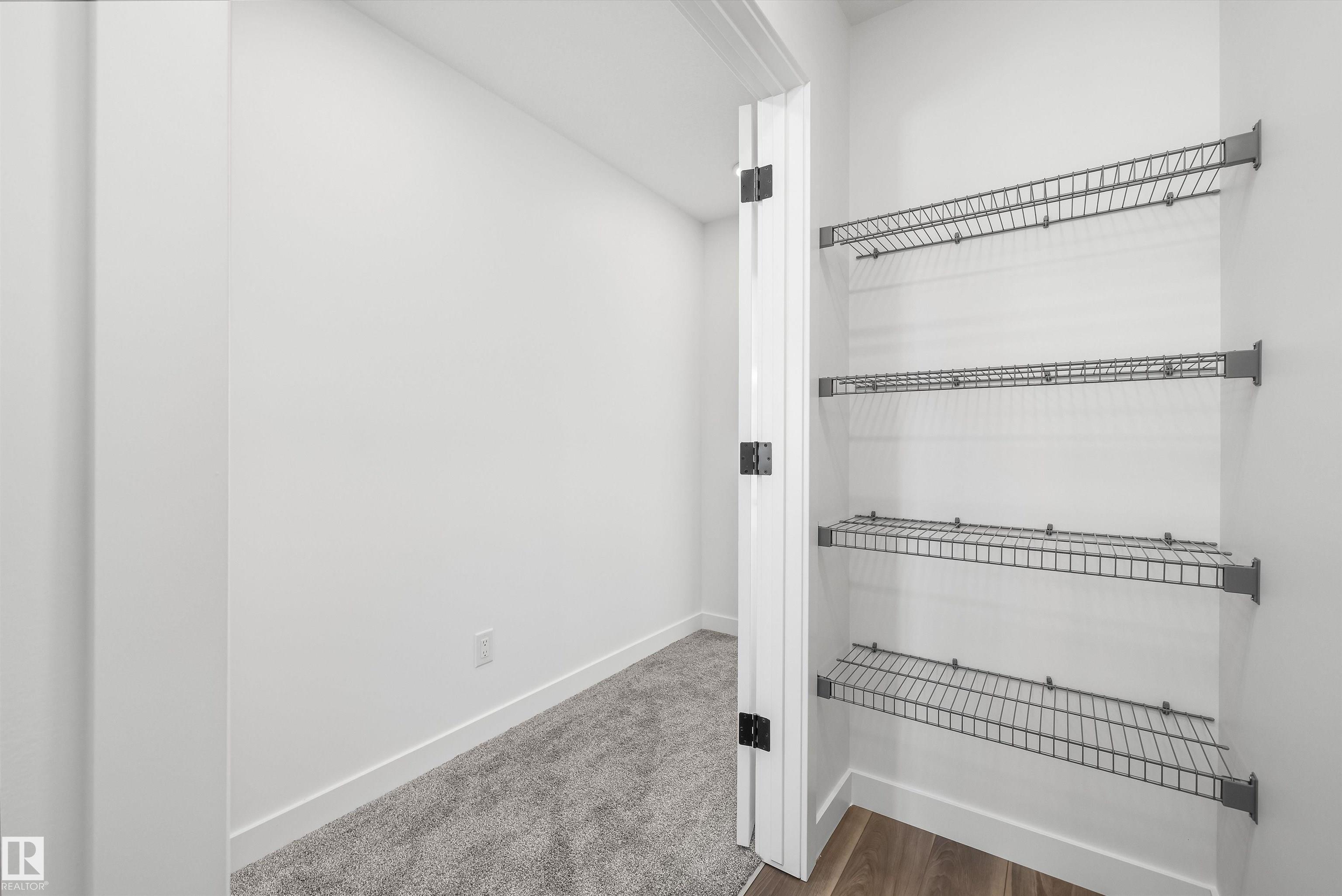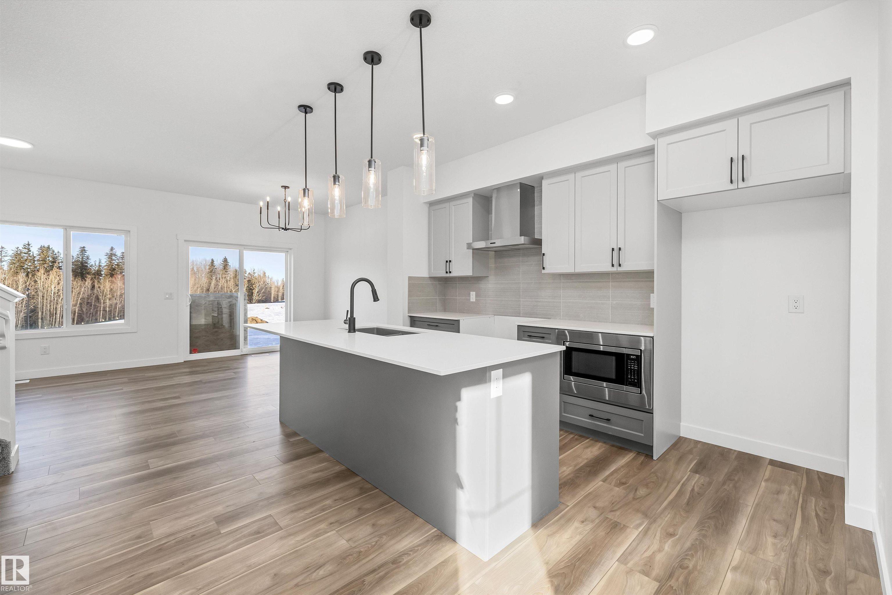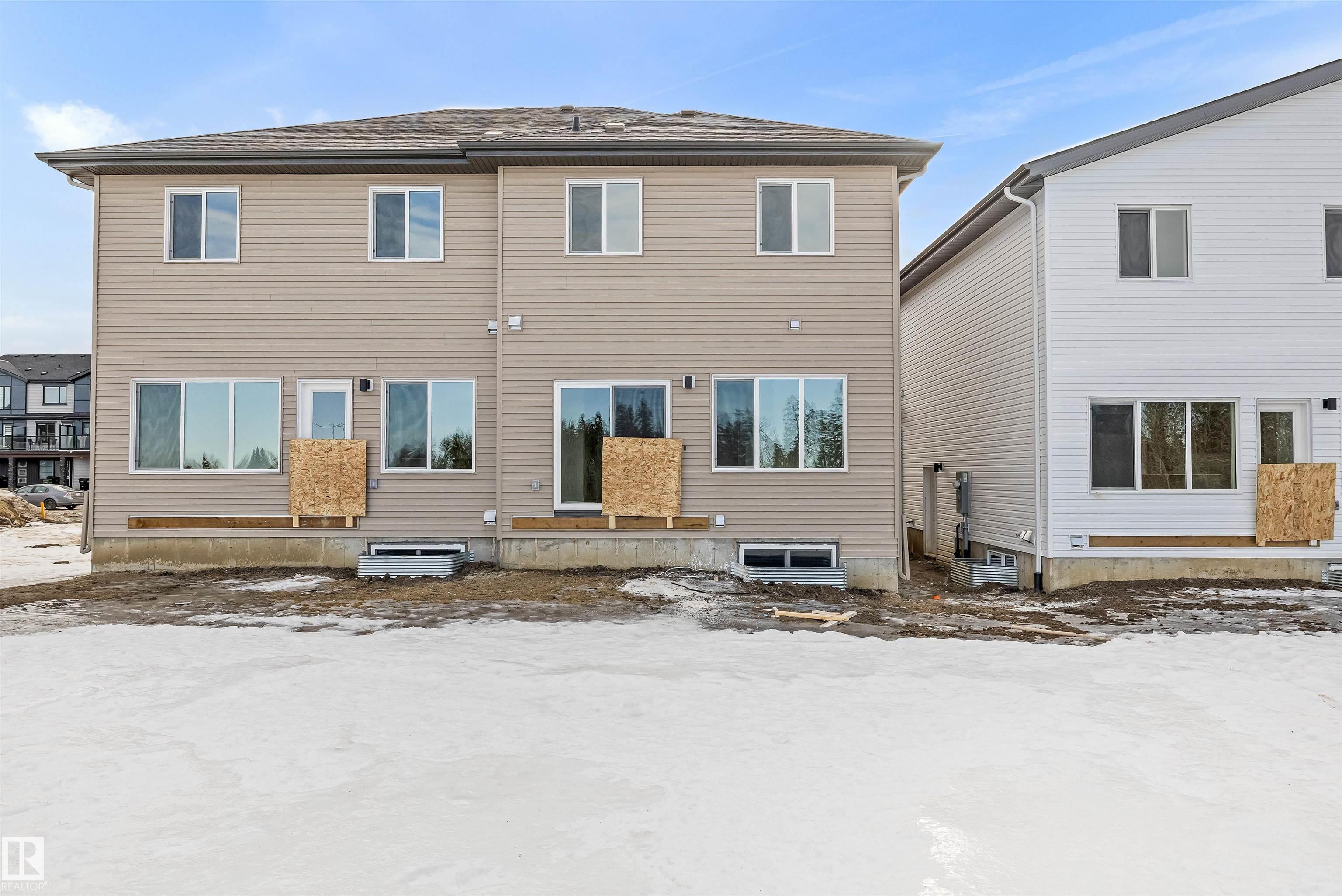 Welcome to the Retreat Duplex, a thoughtfully designed home blending style, comfort, and functionality. The main floor features 9' ceilings, luxury vinyl plank flooring, and a double attached garage with floor drain. A welcoming foyer leads past a convenient half bath into the open-concept kitchen, great room, and dining area. The kitchen showcases quartz countertops, a central island with flush eating ledge and Silgranit undermount sink, pendant lighting, full-height tiled backsplash, chimney-style hood fan, built-in microwave, and upgraded soft-close cabinetry, plus a pantry tucked by the staircase. Large rear windows and a sliding patio door brighten the great room and nook, highlighted by an electric fireplace. Upstairs, the primary suite offers a walk-in closet and spa-like 4-piece ensuite with tub/shower and double sinks, while two additional bedrooms share a 3-piece bath. A laundry closet accommodates a stackable washer/dryer. Black fixtures and basement rough-in are included.