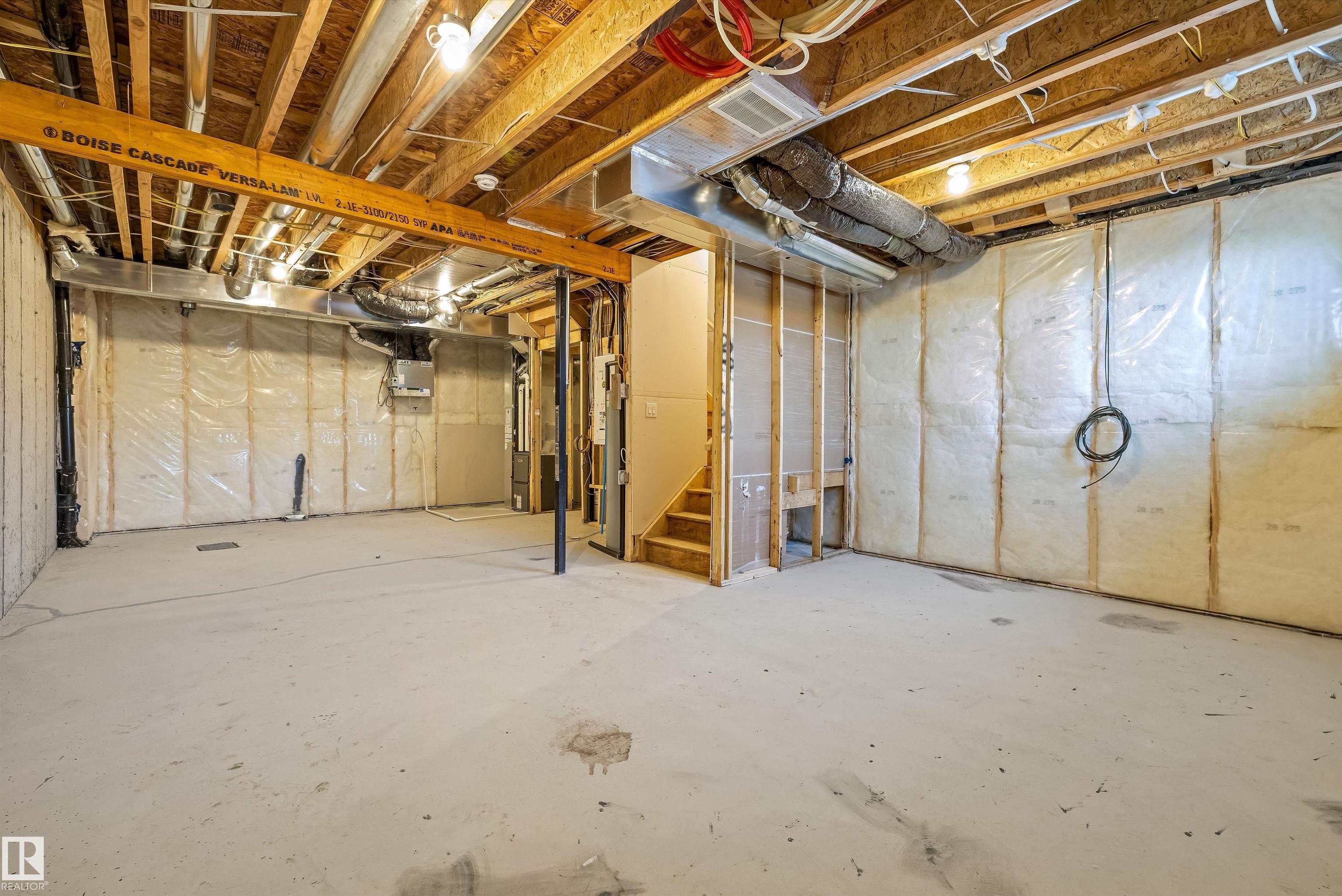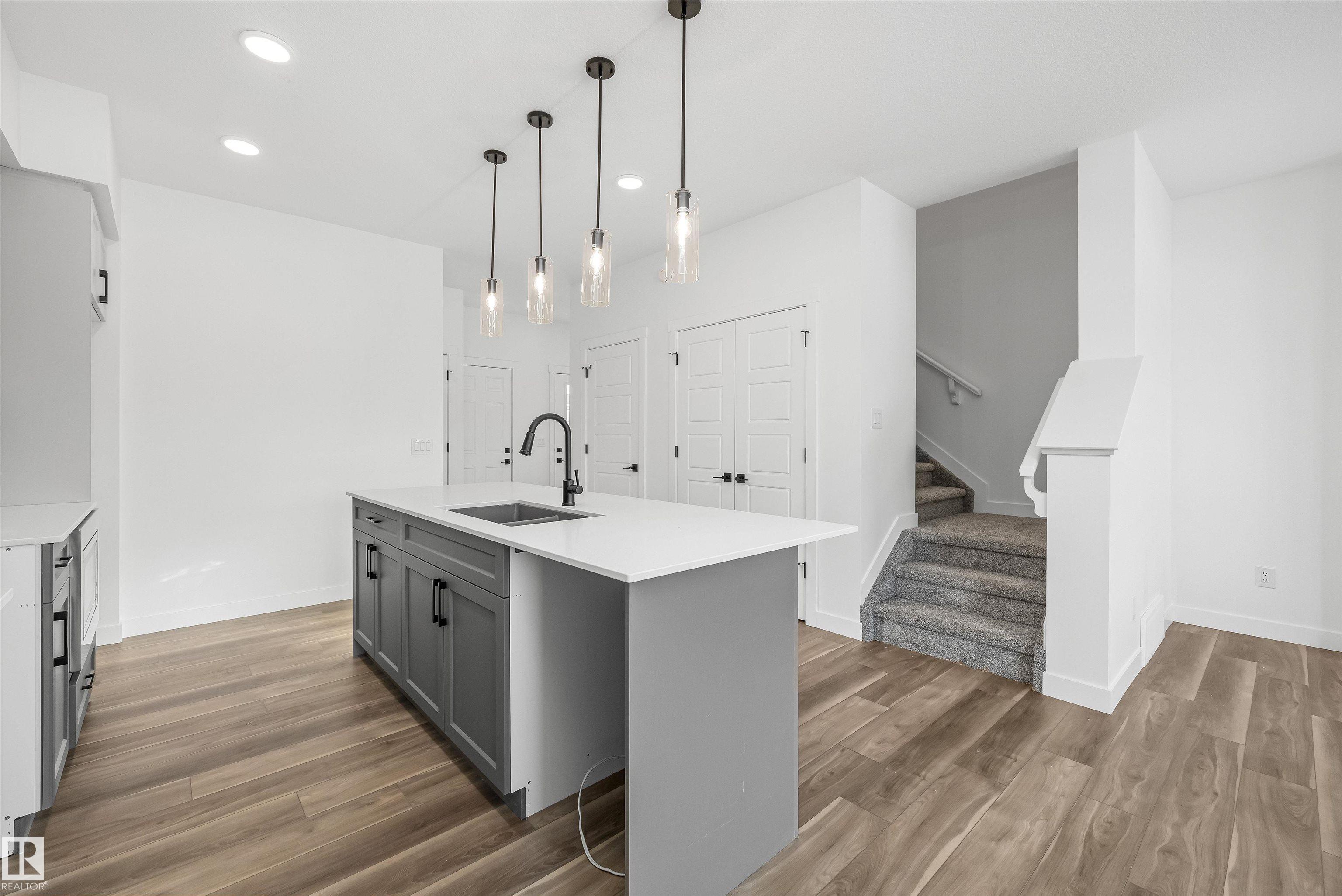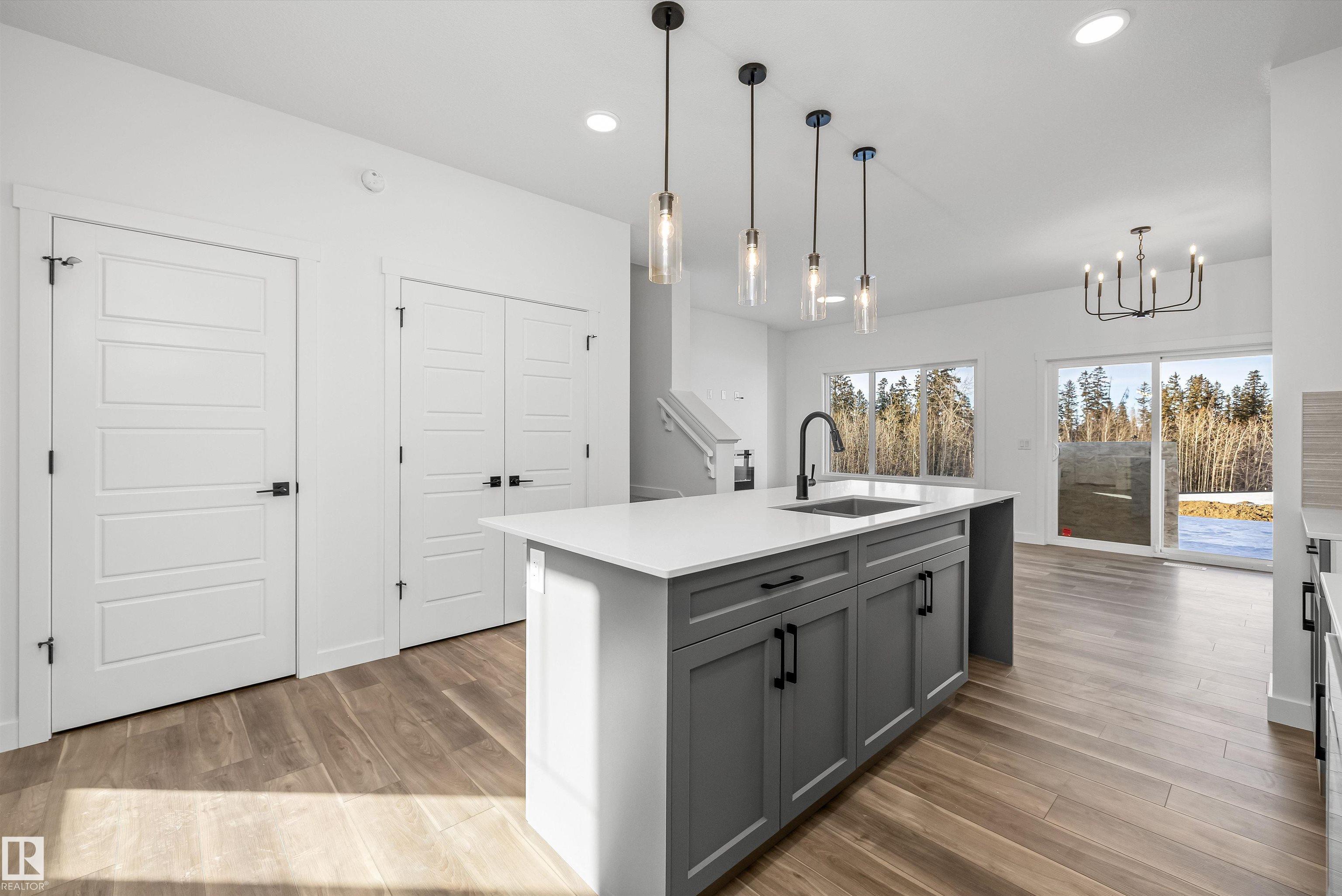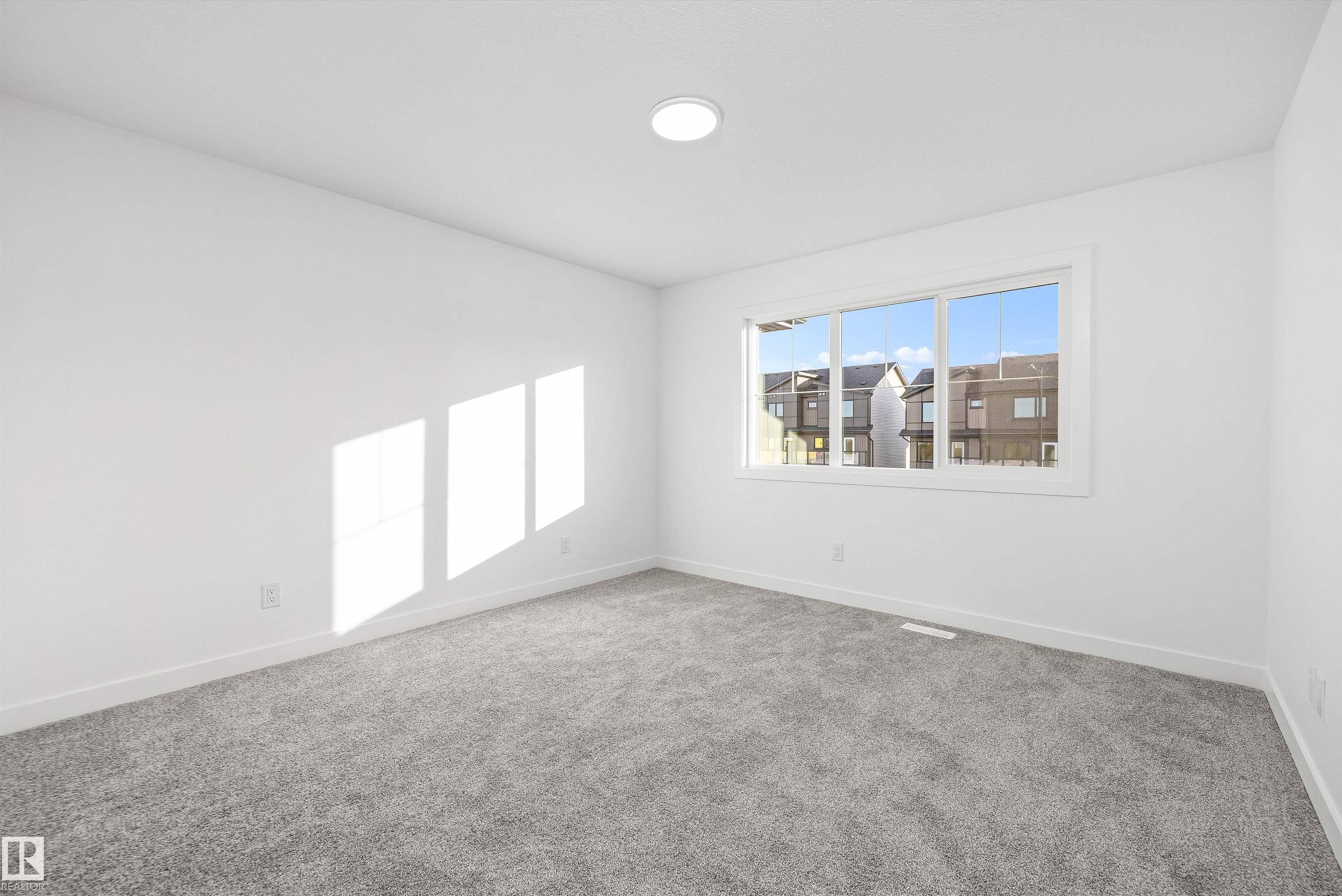 Welcome to the Retreat Duplex, a thoughtfully designed home blending style, comfort, and functionality. The main floor features 9' ceilings, luxury vinyl plank flooring, and a double attached garage with floor drain. A welcoming foyer leads past a convenient half bath into the open-concept kitchen, great room, and dining area. The kitchen showcases quartz countertops, a central island with flush eating ledge and Silgranit undermount sink, pendant lighting, full-height tiled backsplash, chimney-style hood fan, built-in microwave, and upgraded soft-close cabinetry, plus a pantry tucked by the staircase. Large rear windows and a sliding patio door brighten the great room and nook, highlighted by an electric fireplace. Upstairs, the primary suite offers a walk-in closet and spa-like 4-piece ensuite with tub/shower and double sinks, while two additional bedrooms share a 3-piece bath. A laundry closet accommodates a stackable washer/dryer. Black fixtures and basement rough-in are included.