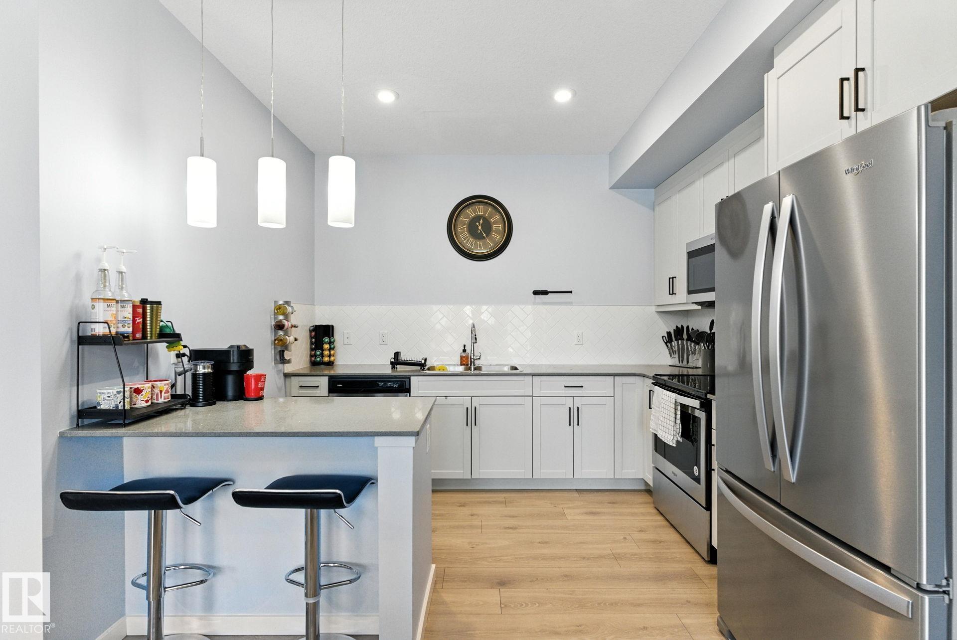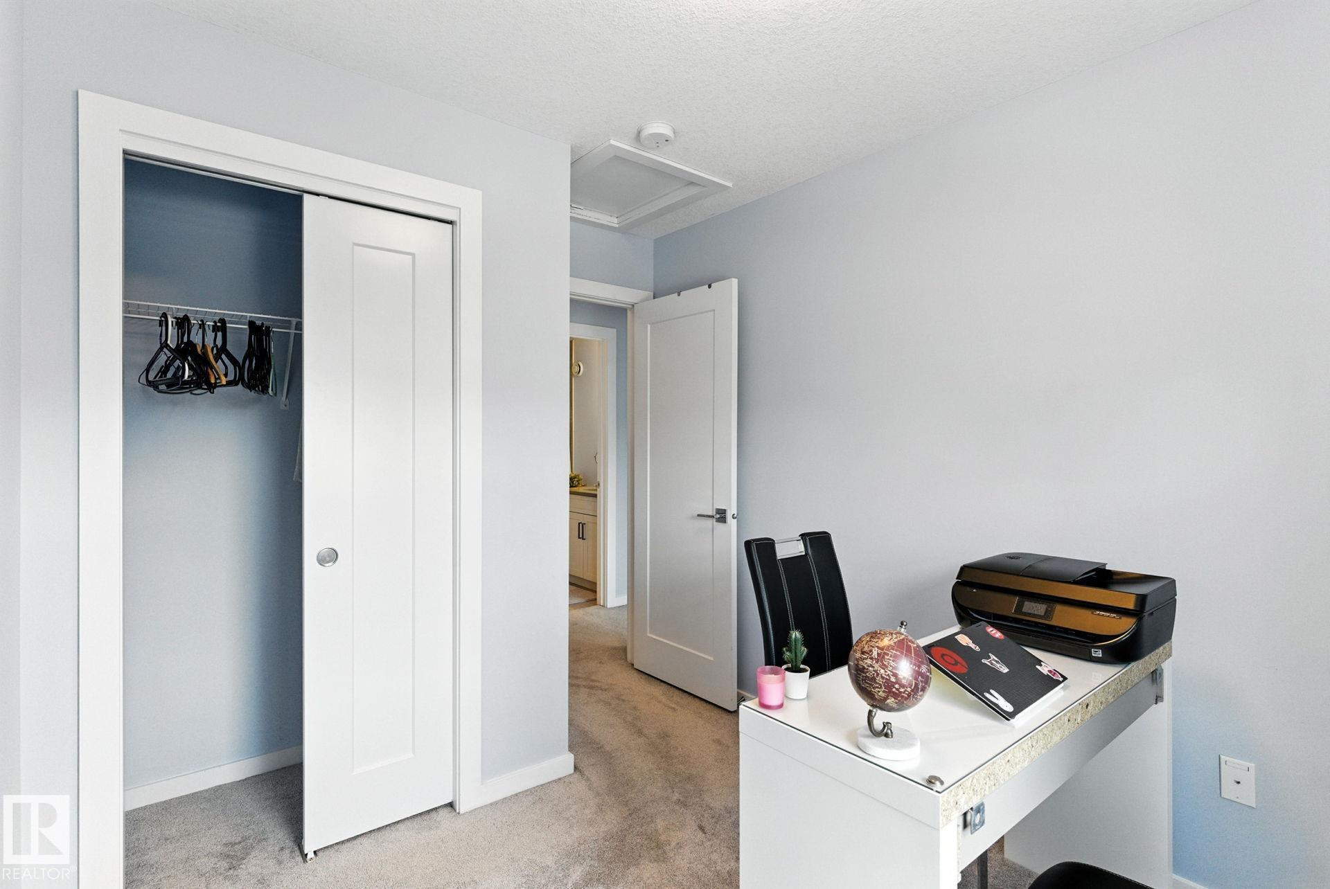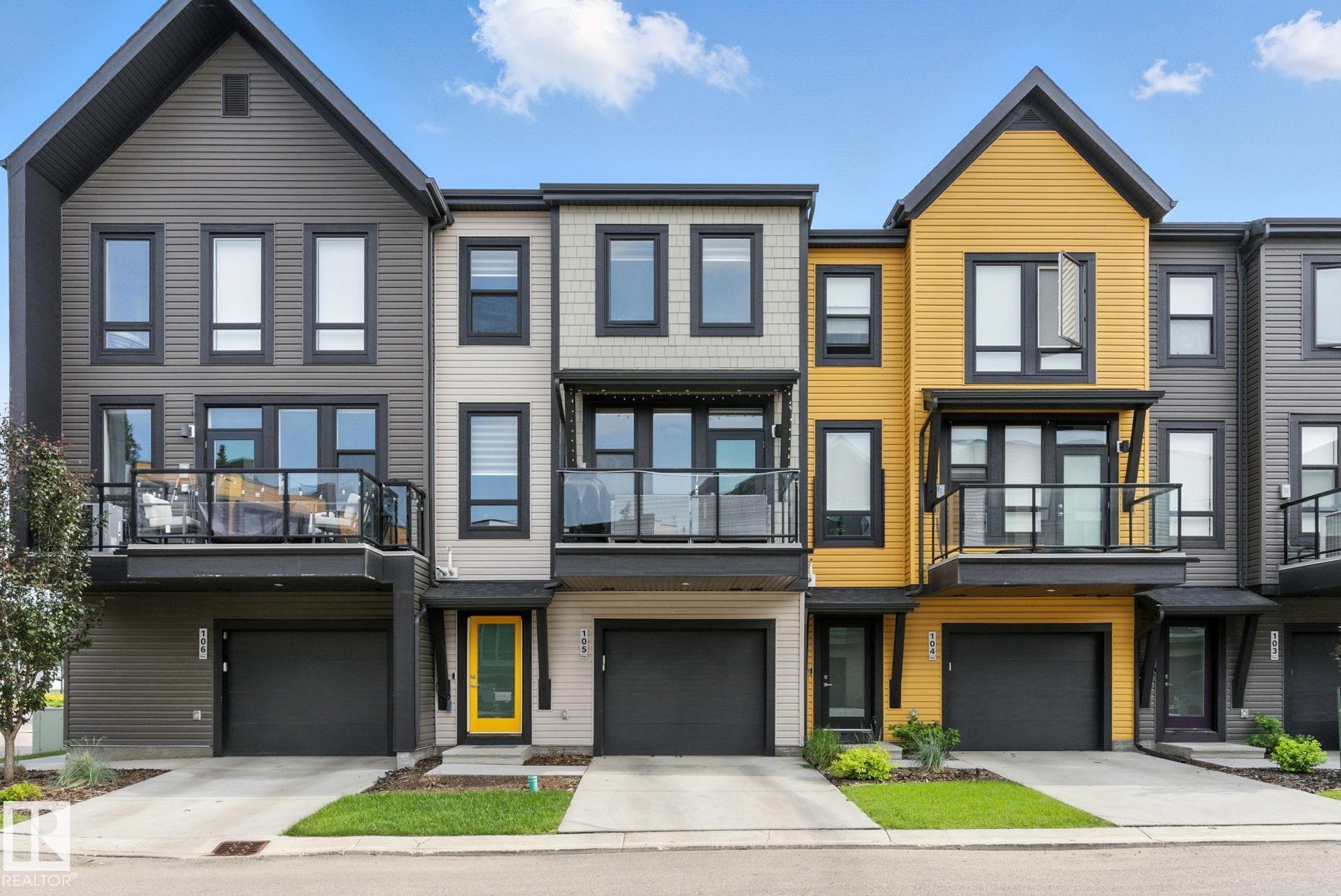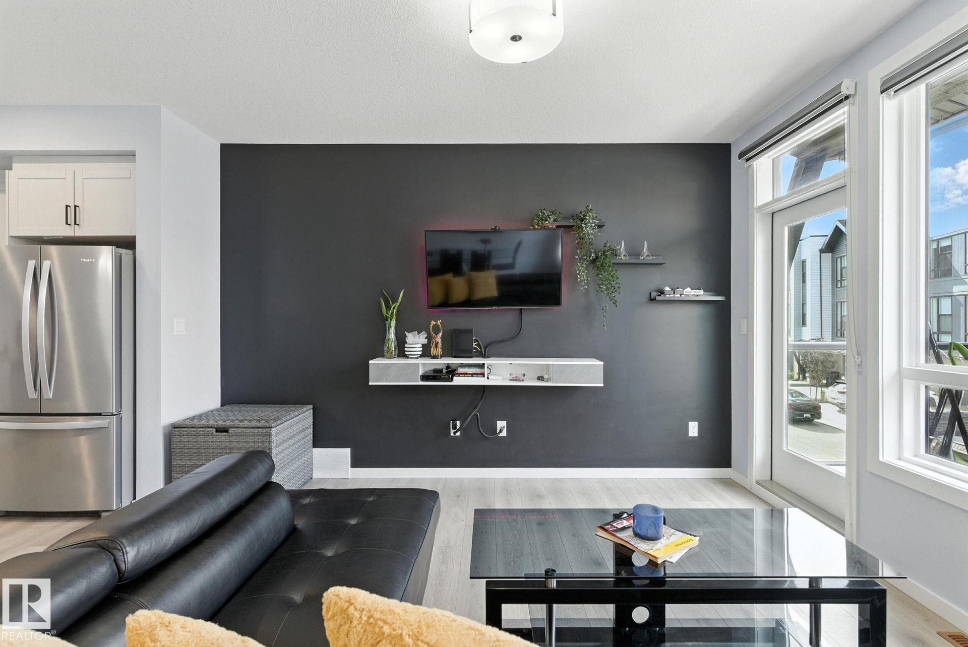 Modern living in Rutherford - Smart style, low fees! A great opportunity to own in South Edmonton. This well-appointed 3-storey townhome welcomes you with a warm foyer and convenient access to your fully finished attached garage. The bright main level features floor-to-ceiling windows, an open-concept kitchen with quartz countertops and stainless steel appliances, a dedicated dining space, and a stylish living area. Upstairs offers two generous bedrooms including a king-sized primary with walk-through closet and ensuite with oversized shower, a 4pc guest bath, and upper laundry. Additional extras - 2pc Guest Bath, Custom Storage solutions and Built-ins in the Garage & Convenient Guest parking (just a few steps away). Nestled in a park-like setting, this home is in the well-managed Pivot complex with the lowest condo fees in South Edmonton--close to parks, trails, schools, shopping, and major commuting routes. What an amazing place to start. Welcome Home!