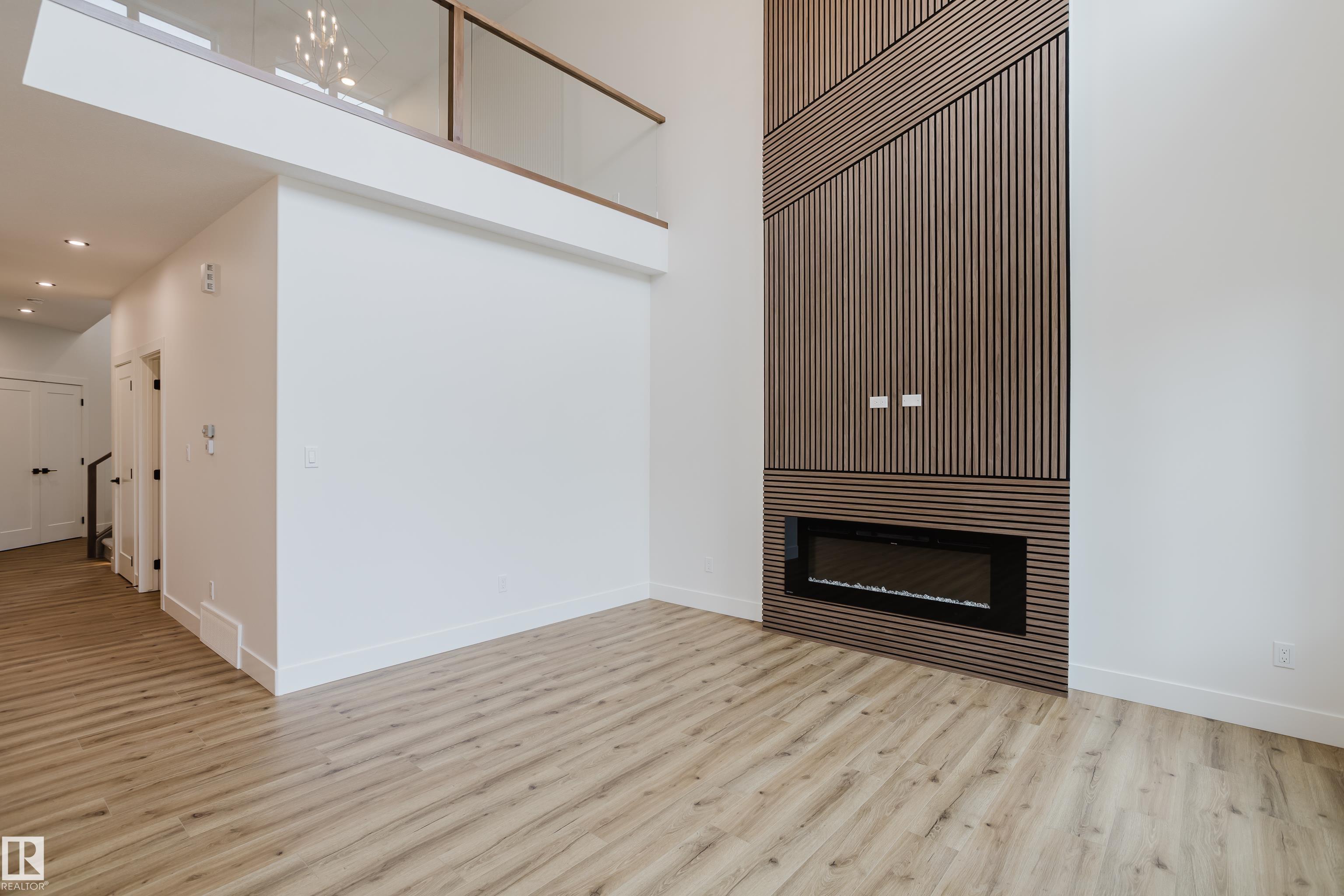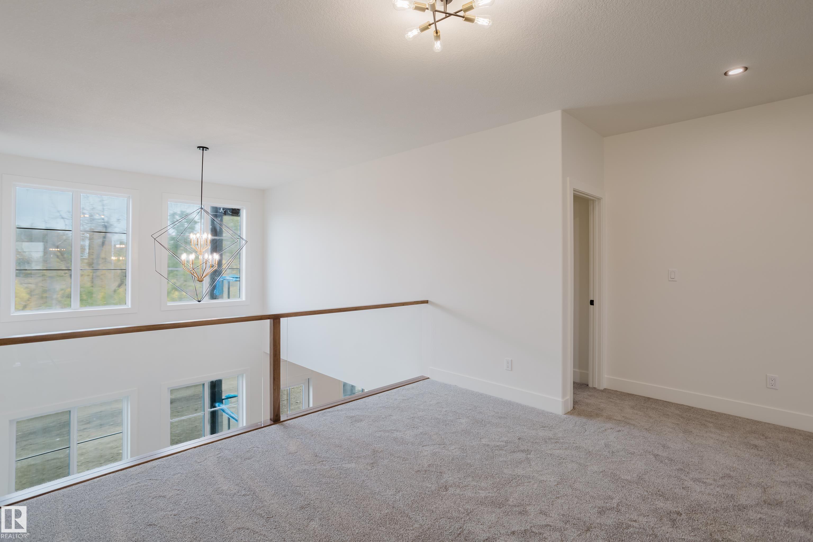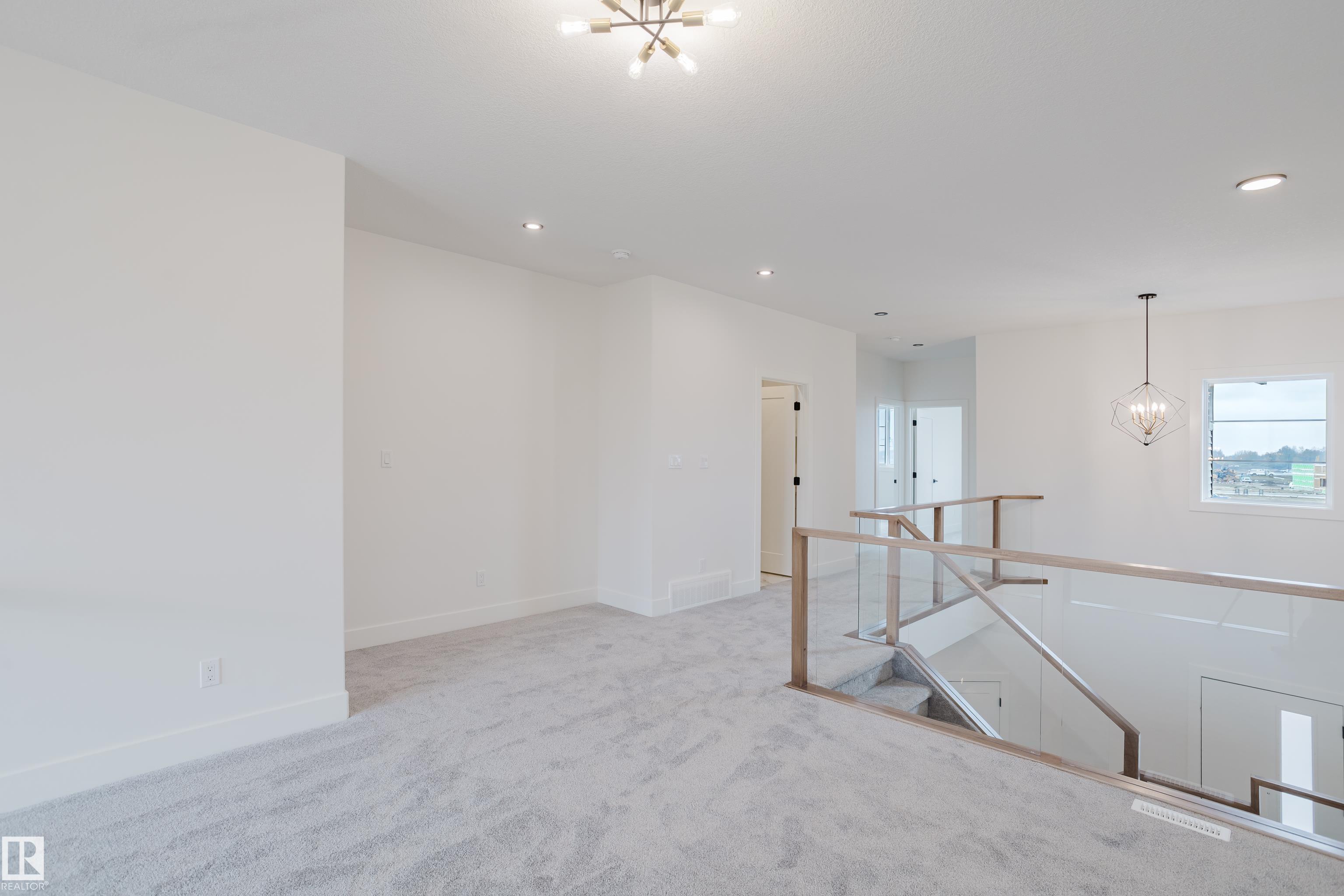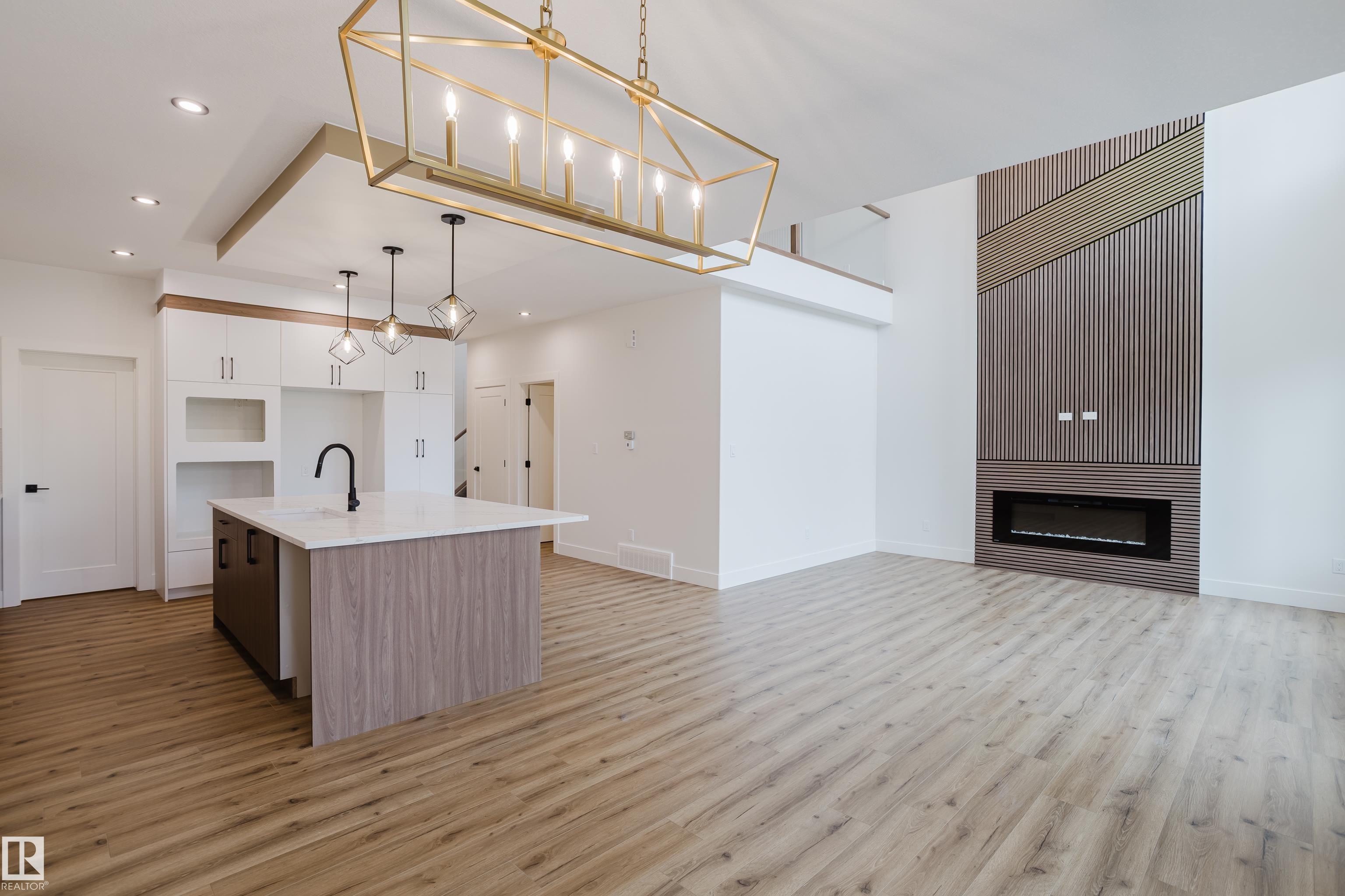 Experience elevated living in this brand new triple car garage home in The Uplands, backing onto a peaceful ravine for stunning views and privacy. This thoughtfully designed residence features a dramatic open-to-below living room with a sleek fireplace, a spacious main floor office, and a full bathroom--perfect for guests or working from home. The extended chef's kitchen offers premium finishes, abundant cabinetry, and a layout built for both function and entertaining. Elegant glass railings and illuminated step lights add a modern touch, while the upper level boasts a generously sized bedroom retreat, a versatile bonus room for family gatherings or relaxation, and a well-appointed laundry room with built-in cabinets for added convenience and organization. Outdoor living is elevated with a covered deck and an upper balcony overlooking the ravine, ideal for morning coffee or evening entertaining. A dedicated side entrance to the basement provides excellent flexibility for future development.